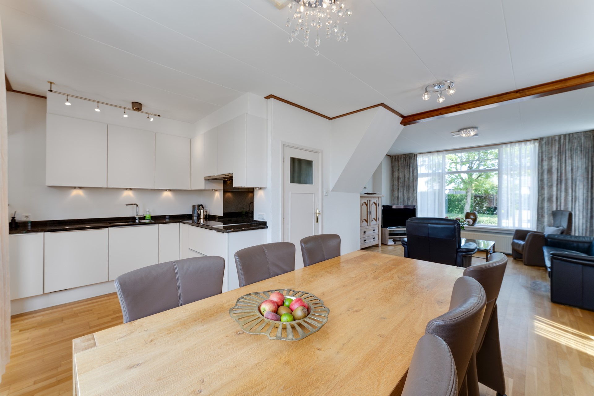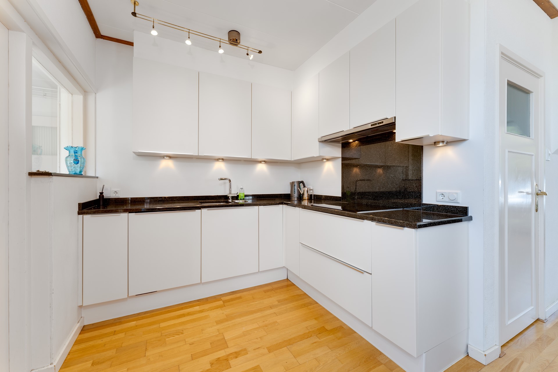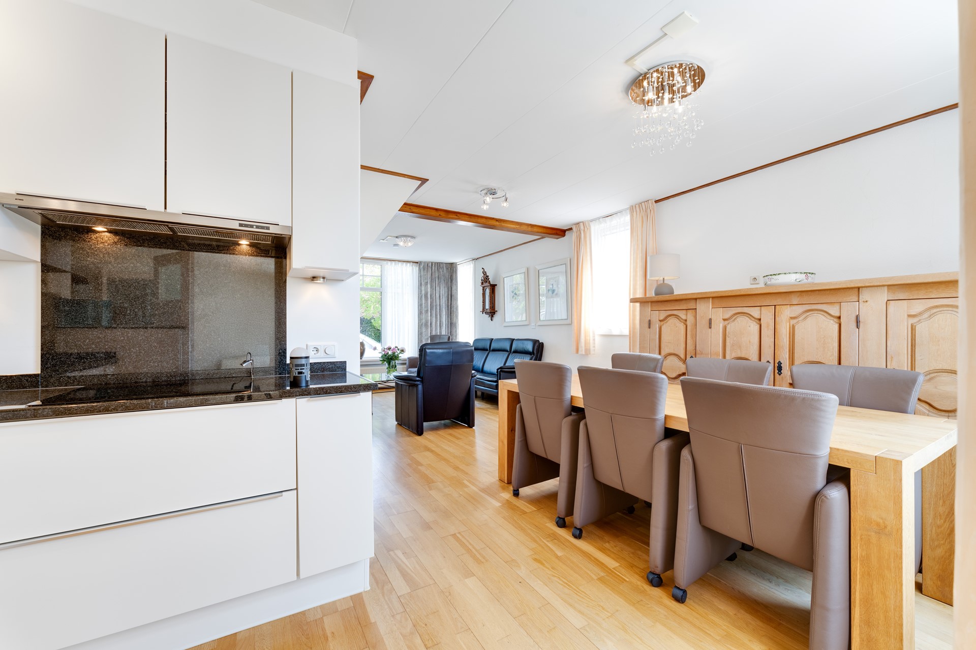 De woonkamer staat in open verbinding met de keuken, die functioneel is ingericht en voorzien van diverse inbouwapparatuur. Met veel werk- en kastruimte én zicht op de tuin is dit een prettige plek om te koken en te leven.
