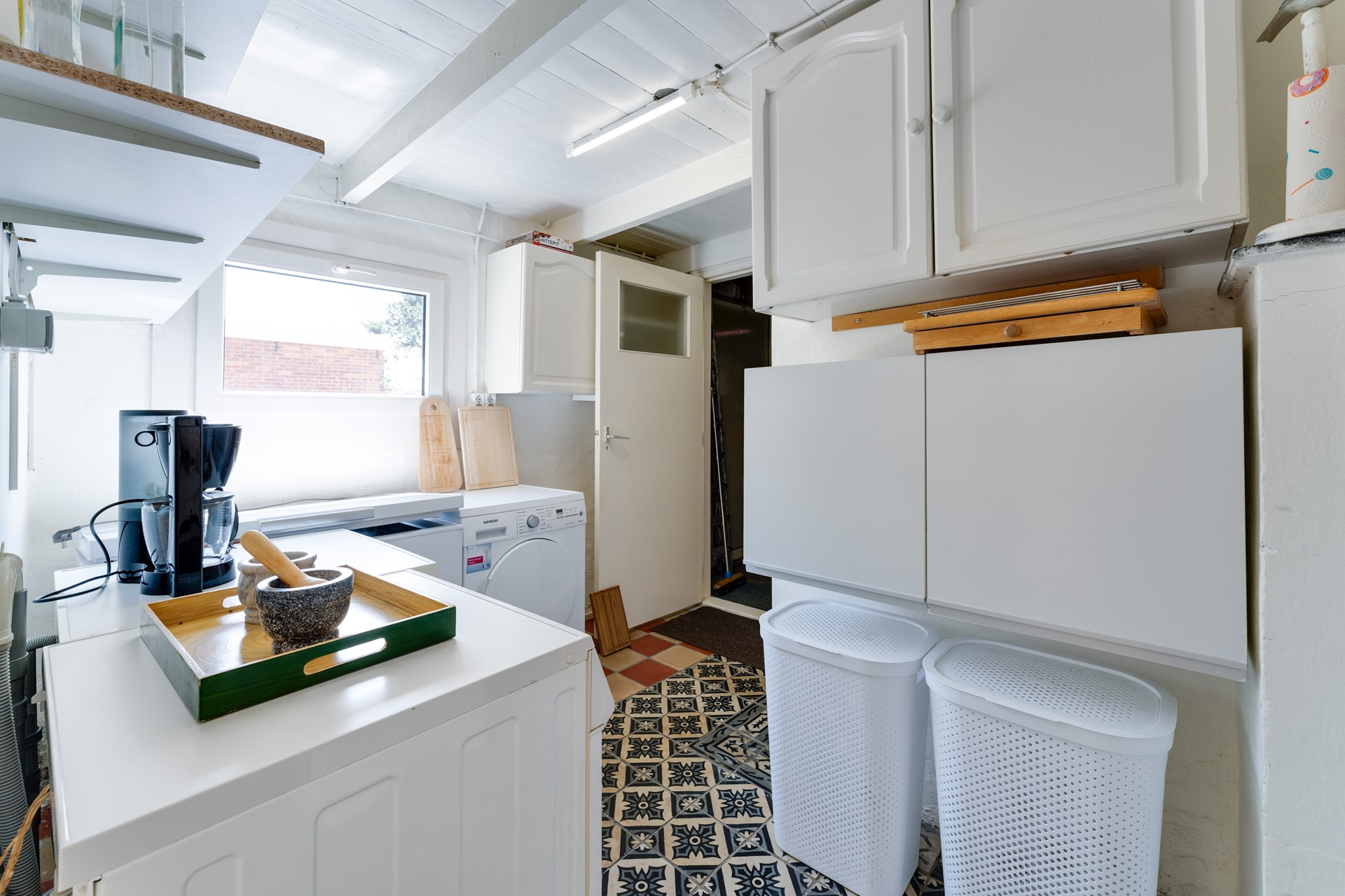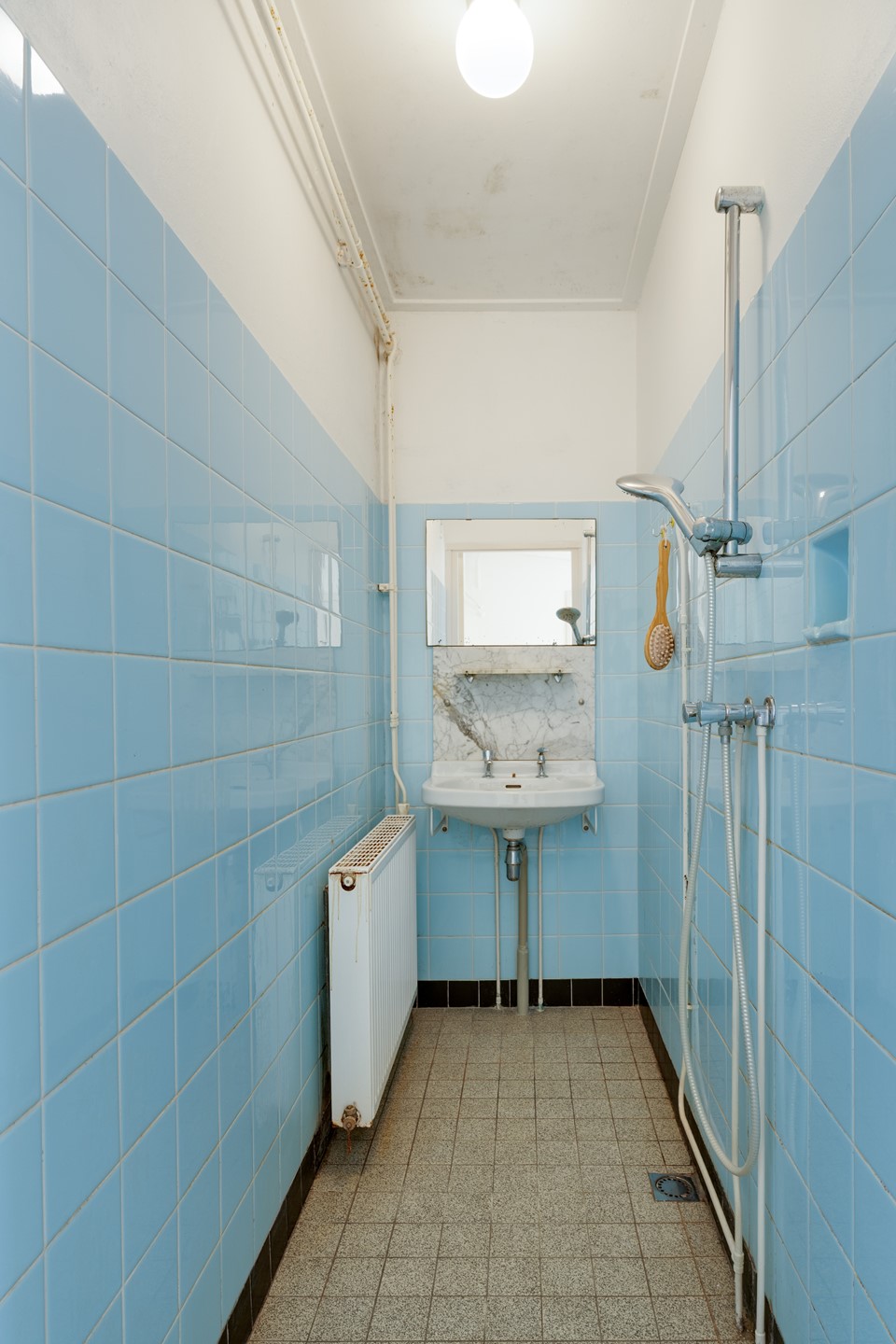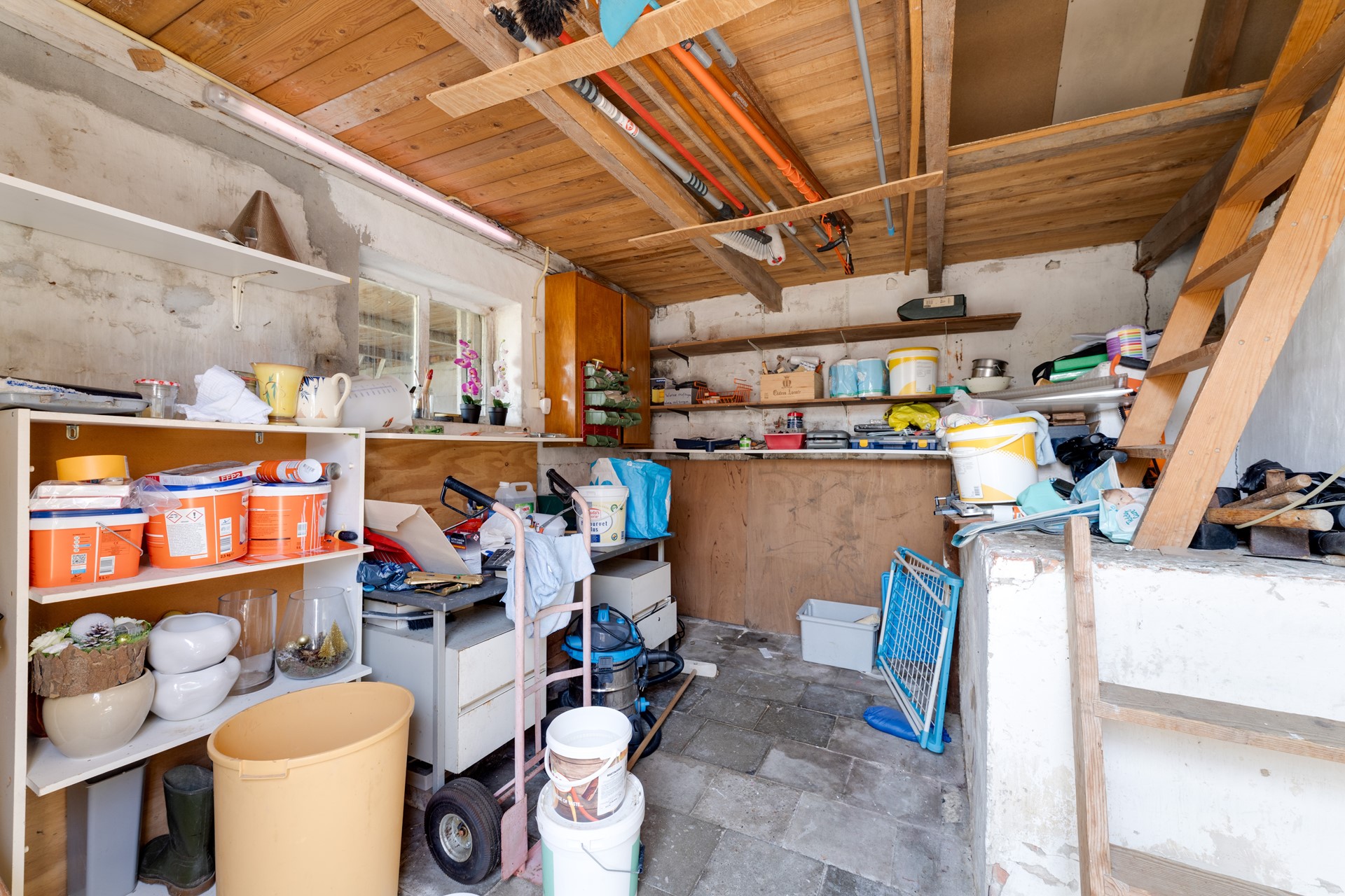 Aangrenzend aan de keuken bevindt zich de badkamer met douche en wastafel – praktisch gesitueerd op de begane grond. Via een tweede hal bereik je de bijkeuken, die overloopt in een berging en ruime werkplaats. Deze extra ruimtes zijn ideaal voor klussers, hobbyisten of als extra opslag en bieden directe toegang tot de achtertuin.