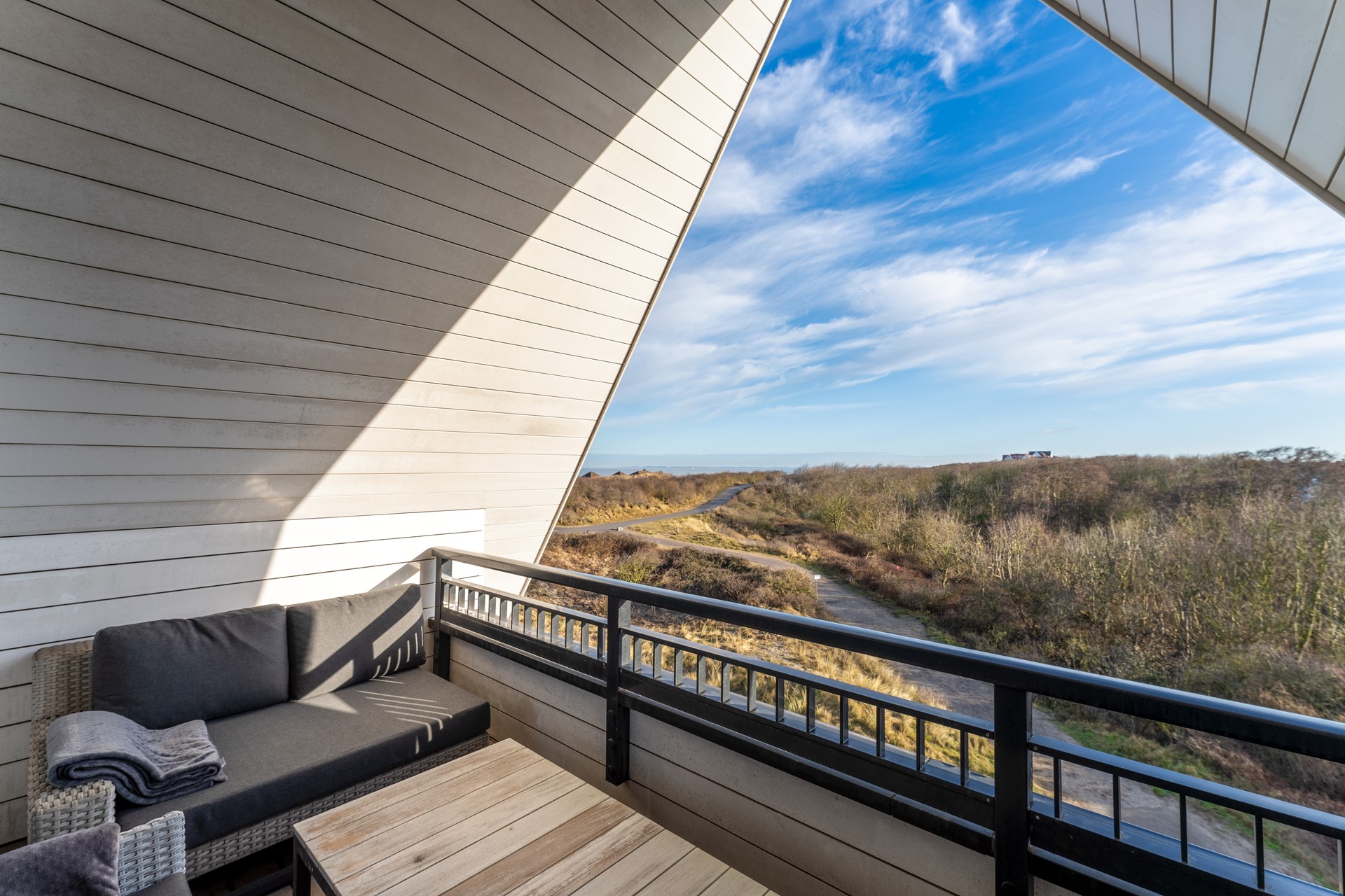 - Het noordoostelijk balkon biedt juist verkoeling en een prachtig uitzicht over duinen en omgeving.