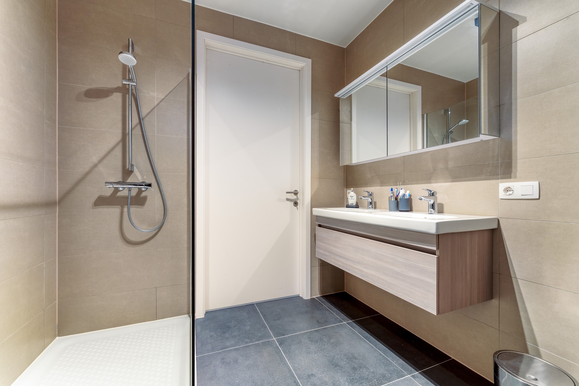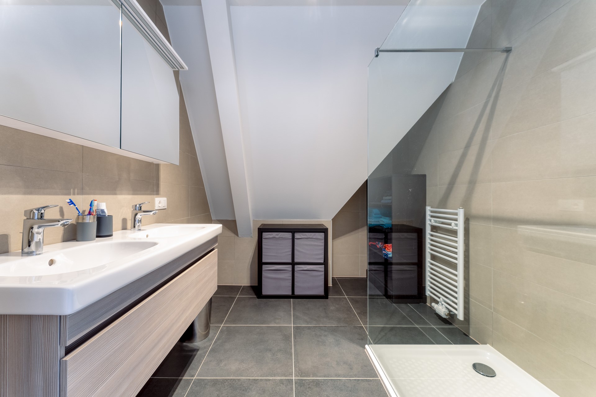 • Moderne badkamer met inloopdouche en dubbele wastafel