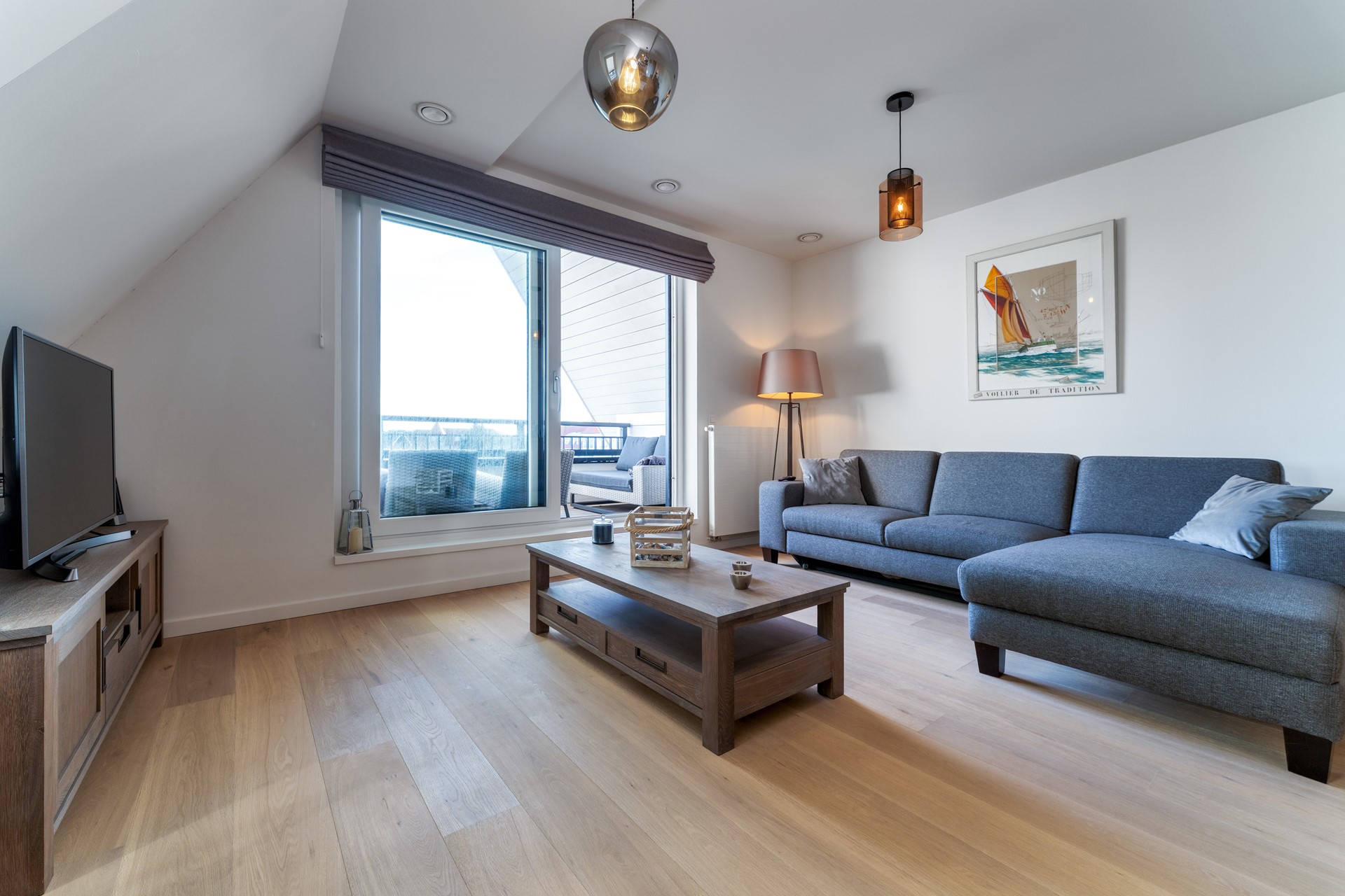 De woonkamer is ruim opgezet en geniet veel natuurlijk licht dankzij de grote raampartijen en directe toegang tot één van de balkons. Vanuit hier heb je een prachtig uitzicht richting zee en boulevard. De schuifpui zorgt voor een naadloze overgang tussen binnen en buiten.