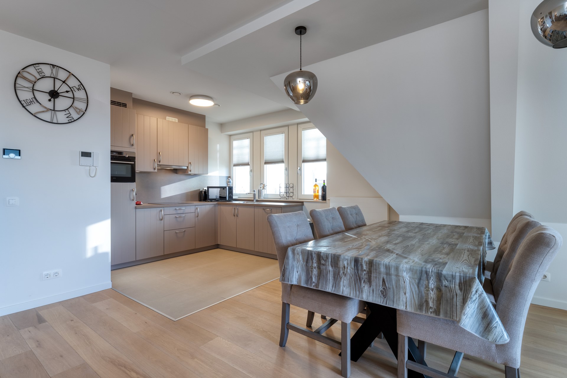 De open keuken is modern en strak vormgegeven en uitgerust met hoogwaardige AEG-inbouwapparatuur, waaronder een combi-oven, vaatwasser en kookplaat. De opstelling sluit perfect aan op de woonkamer en creëert een gezellige leefomgeving.