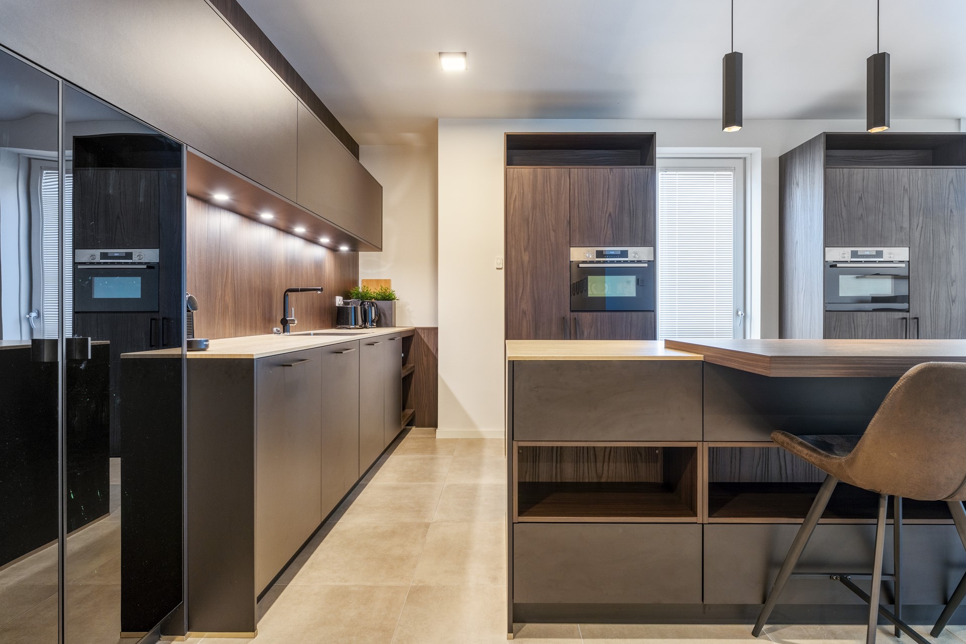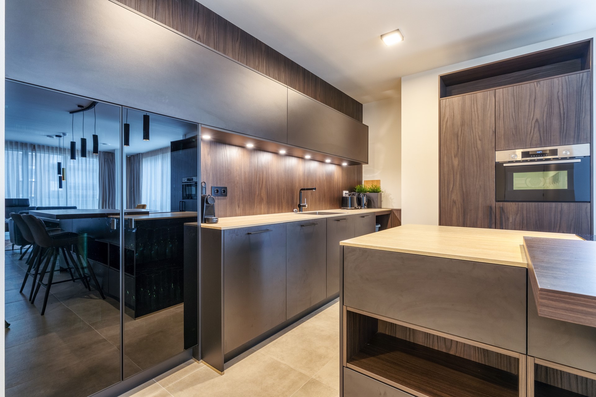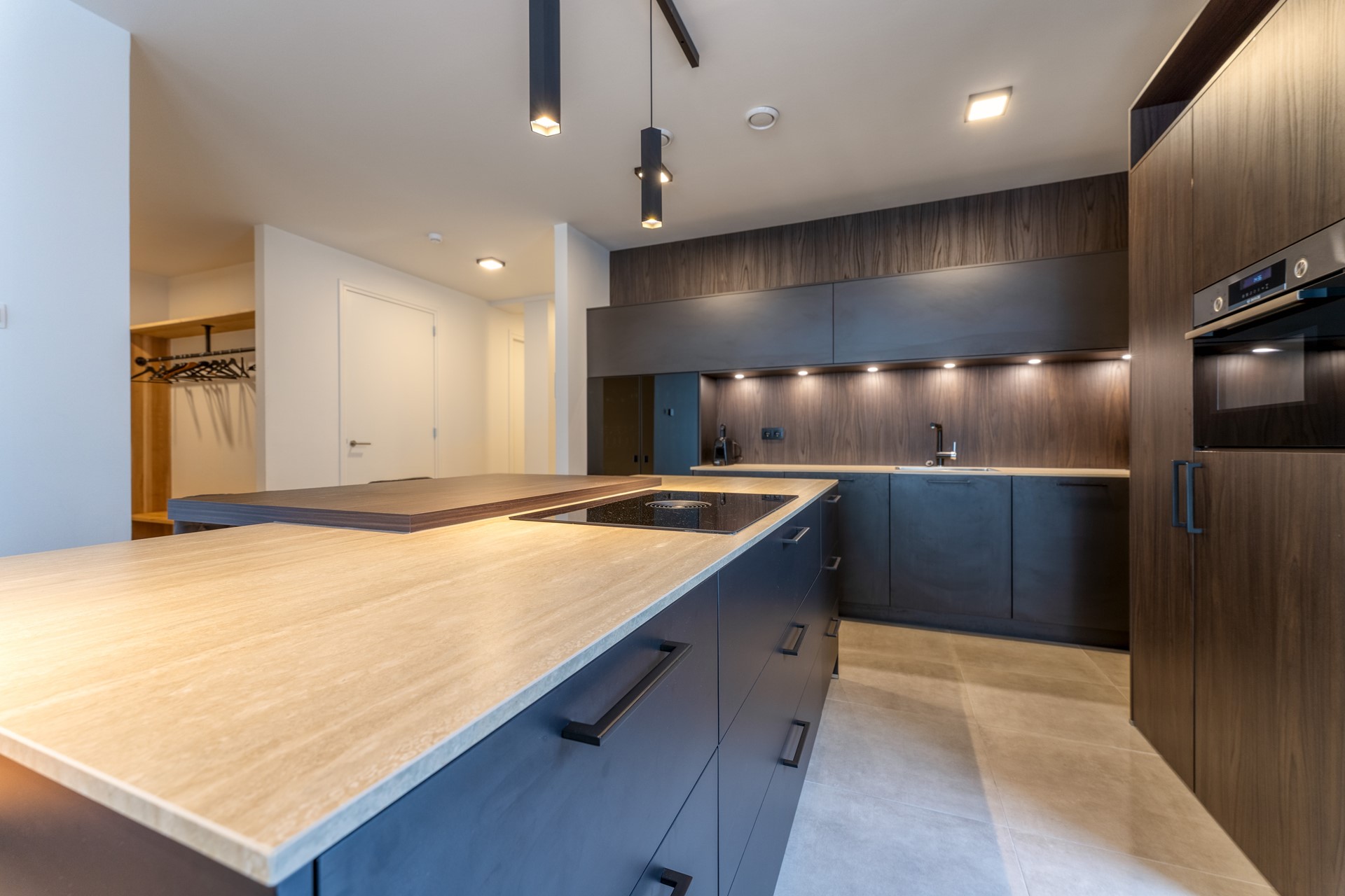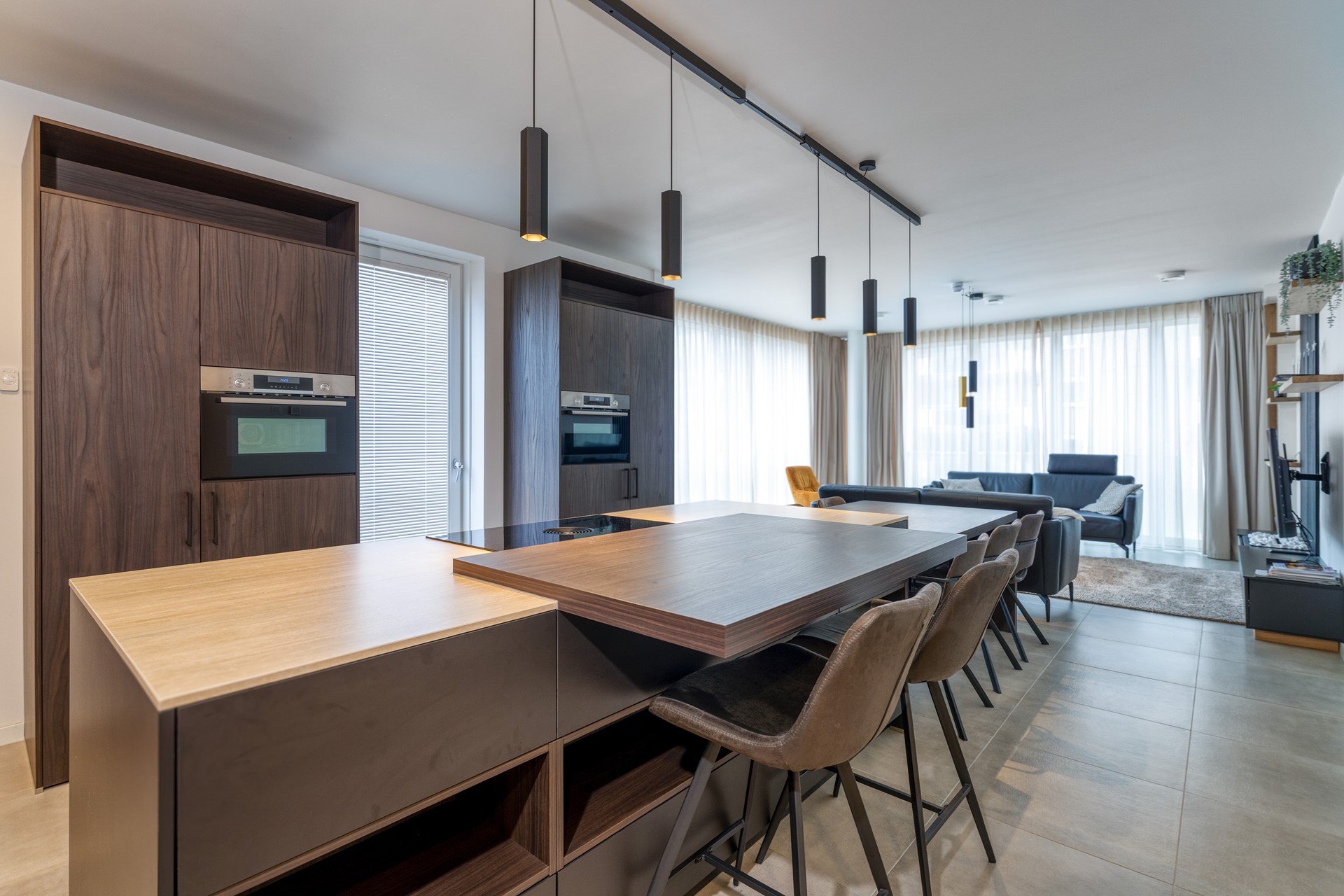 De open keuken is stijlvol geïntegreerd in de leefruimte en voorzien van moderne inbouwapparatuur, waaronder een inductiekookplaat, combi-oven, vaatwasser en koelkast met vriesvak. De strakke lijnen, warme materialen en praktische indeling maken het een aangename plek om te koken of samen te borrelen.