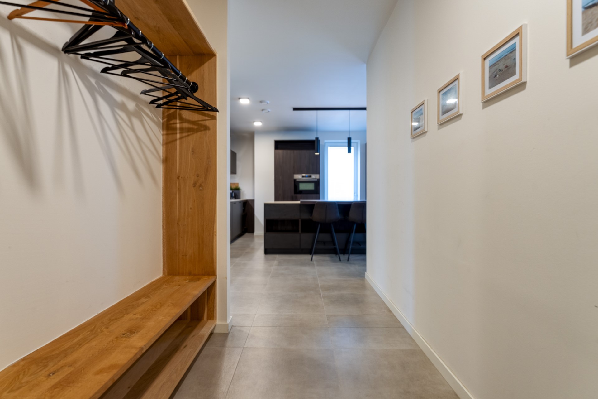De woonkamer biedt voldoende plaats voor een royale zithoek en eettafel, en de openslaande ramen zorgen ervoor dat het binnen-buitengevoel direct aanwezig is. Vanuit de woonkamer kijk je richting zee — een uitzicht dat elke dag weer anders is, maar altijd rustgevend.