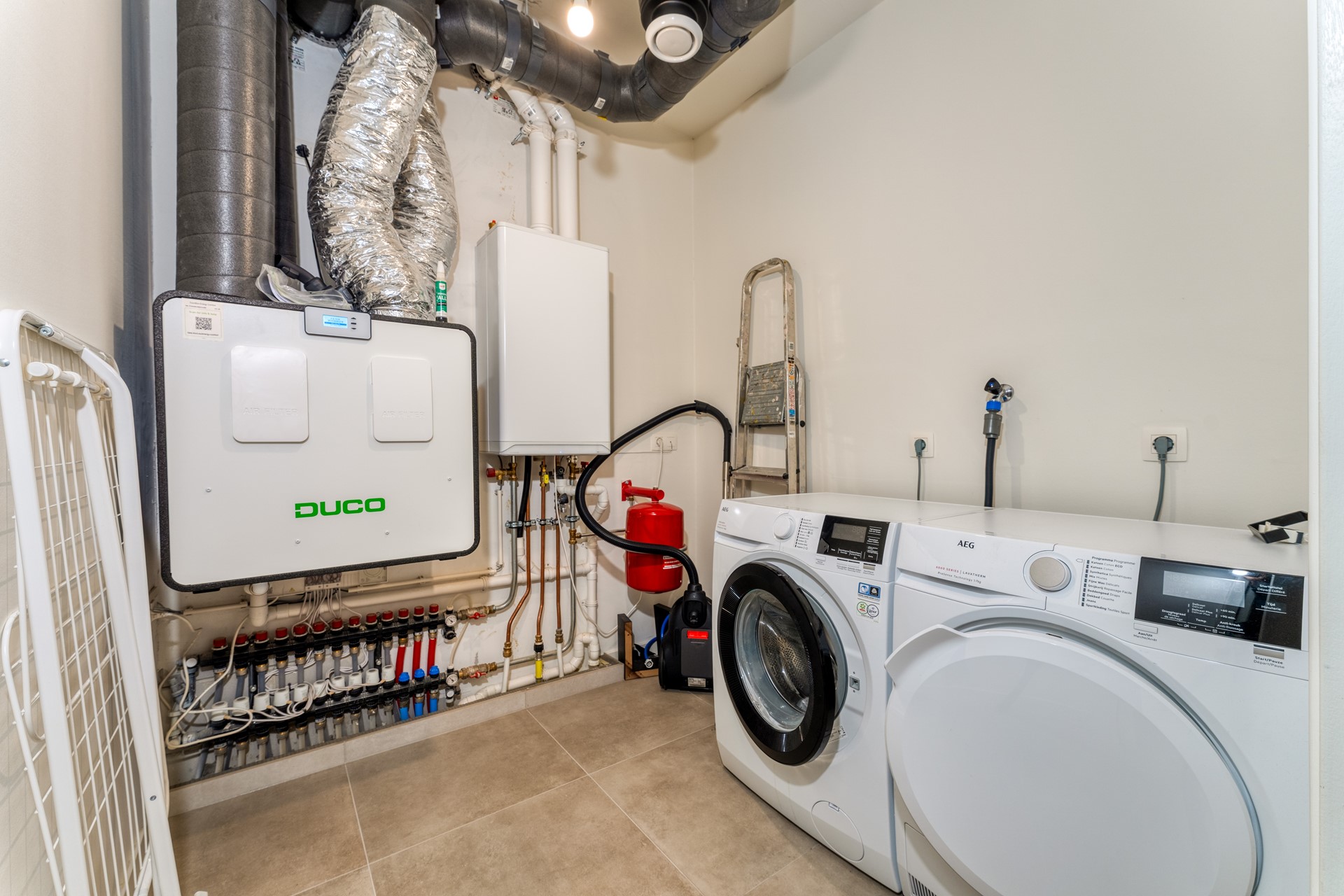 Aangrenzend bevindt zich een praktische berging met aansluitingen voor wasmachine en droger, ideaal om de leefruimte netjes en overzichtelijk te houden. In de hal is een apart toilet aanwezig.