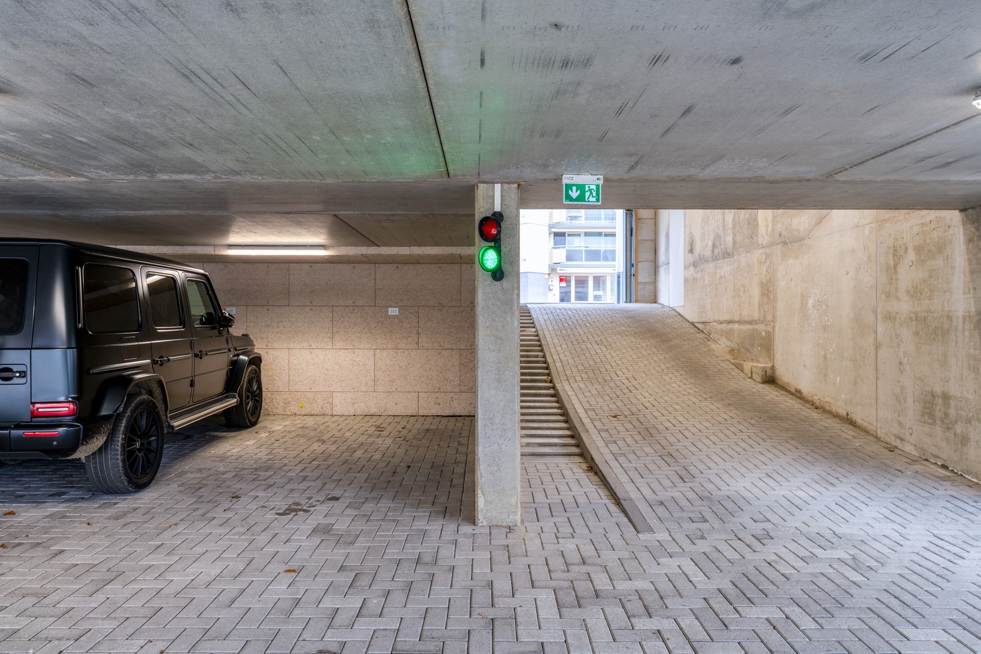 In de halfverdiepte garage bevindt zich een privéparkeerplaats die bij het appartement hoort. Daarnaast is er een eigen berging beschikbaar en is er in de omgeving voldoende openbare parkeerruimte.
