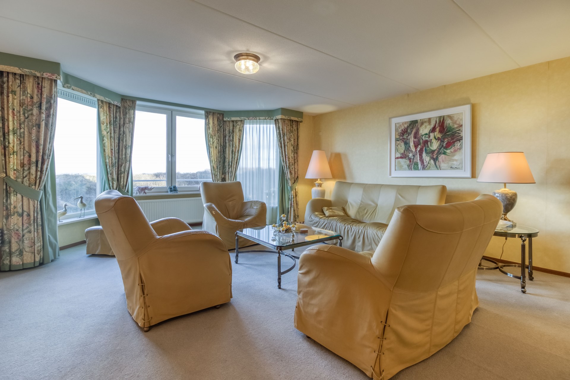 De woonkamer is royaal en opvallend licht dankzij de grote ramen die uitkijken over de duinen en de zee. De open keuken sluit hier direct op aan en is uitgerust met diverse inbouwapparatuur, waaronder een 4-pits gaskookplaat, afzuigkap, koelkast met vriesvak, combimagnetron en vaatwasser.