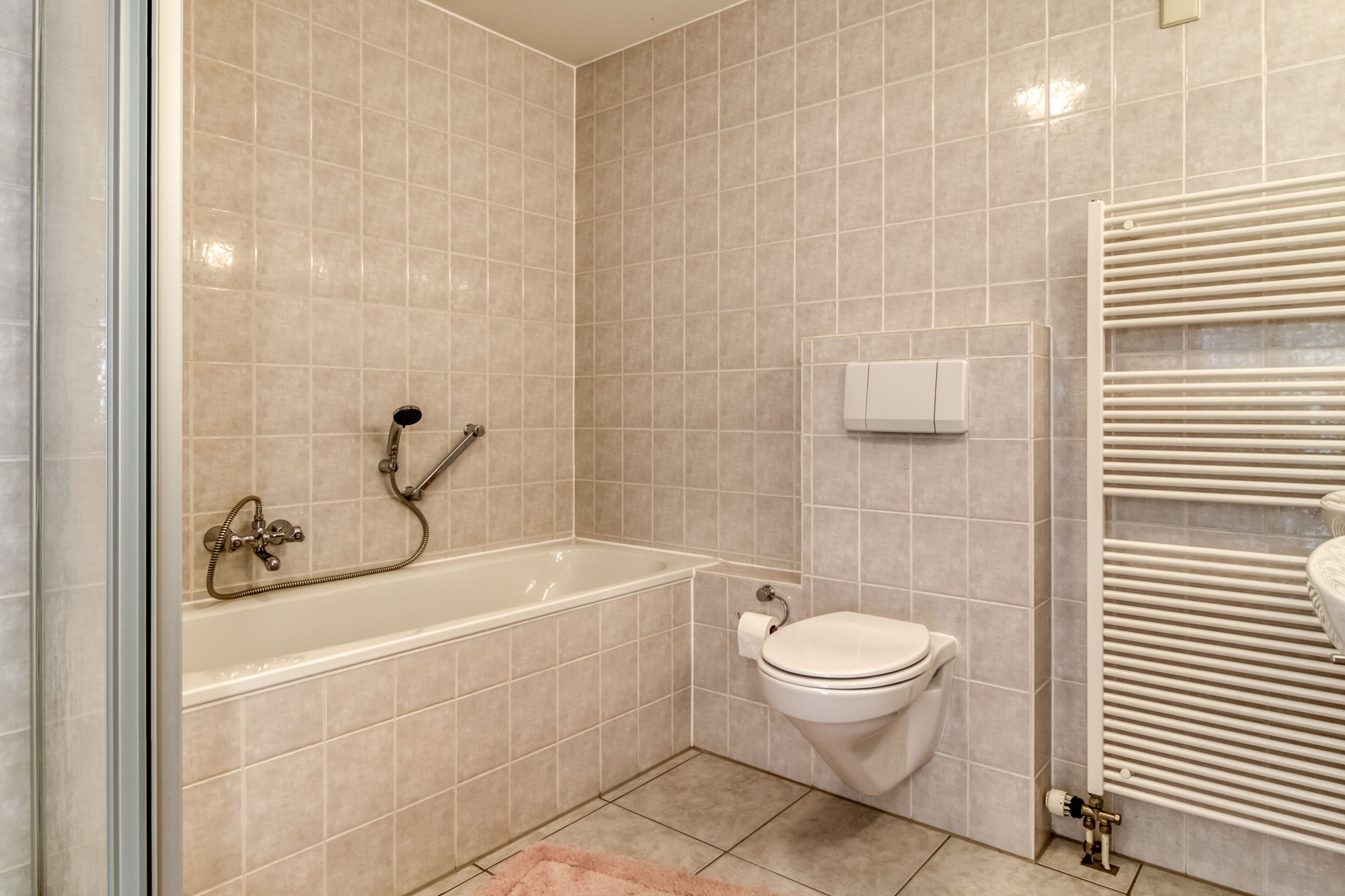 De ruime badkamer is ingericht met een ligbad, aparte douche, een tweede toilet en dubbele wastafel — een praktisch en comfortabel geheel.