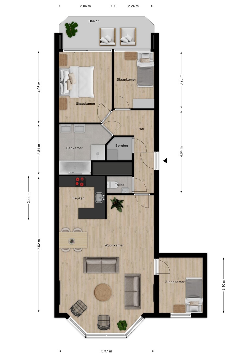 Het appartement beschikt over drie comfortabele slaapkamers. De grootste slaapkamer biedt directe toegang tot het zonnige balkon op het zuiden. De tweede slaapkamer is ideaal als kinder- of logeerkamer. De derde slaapkamer is bereikbaar via de woonkamer en kan uitstekend dienen als extra slaap-, werk- of hobbykamer.