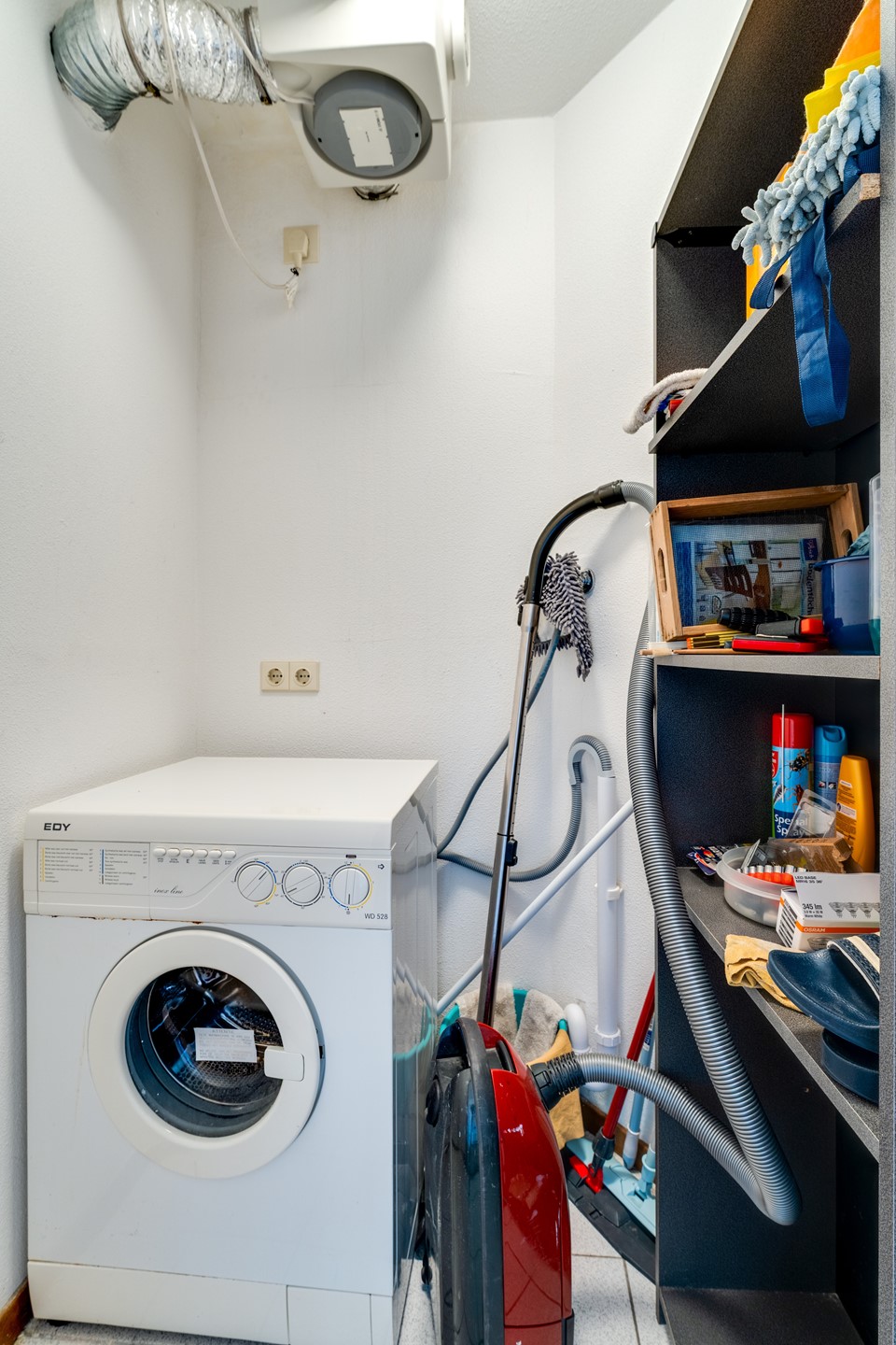 De keuken, uitgevoerd in een praktische U-opstelling, is voorzien van diverse inbouwapparatuur, waaronder een 4-pits gaskookplaat, combioven, spoelbak, dampkap, koelkast met vriesvak en vaatwasser.