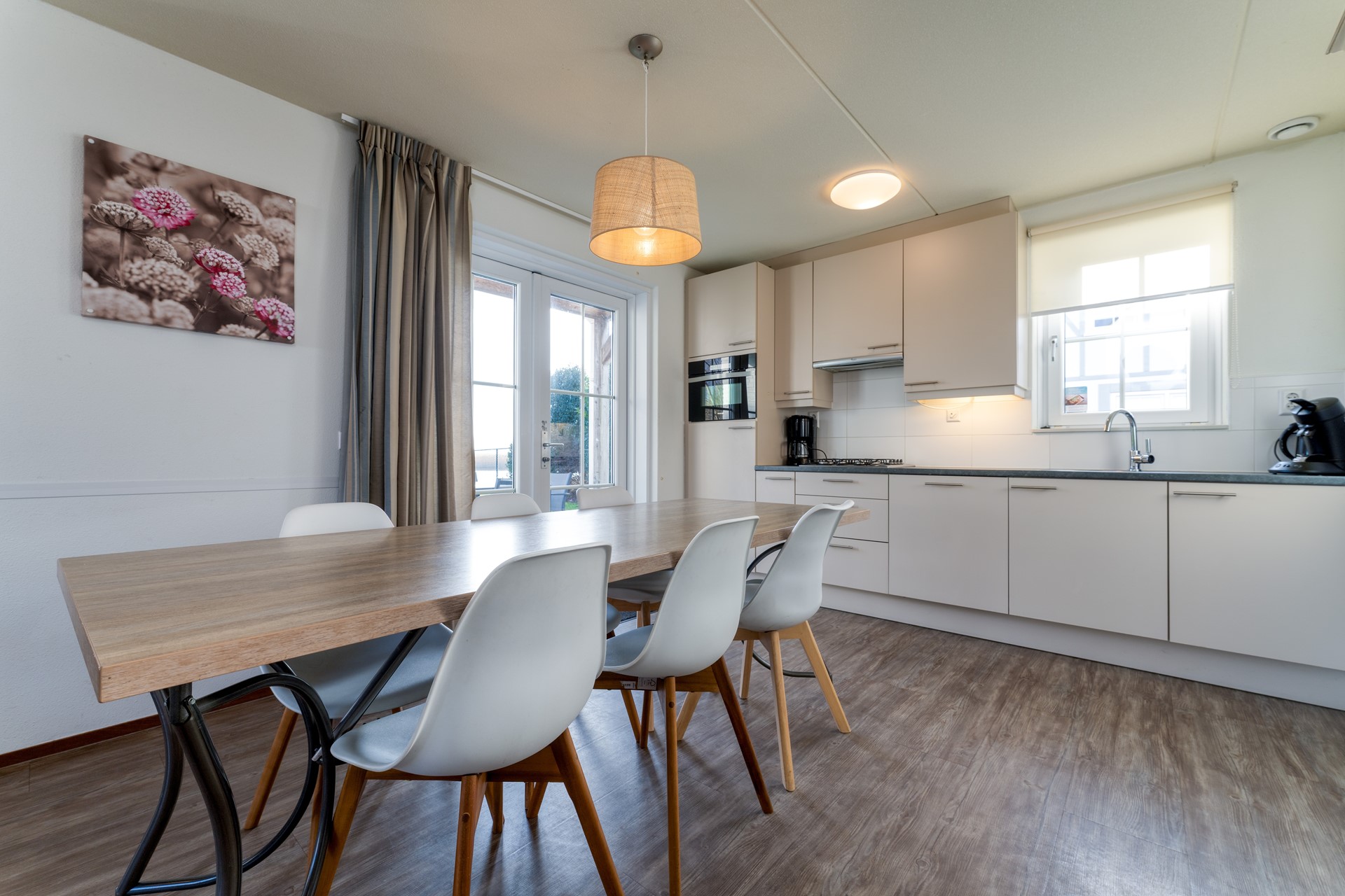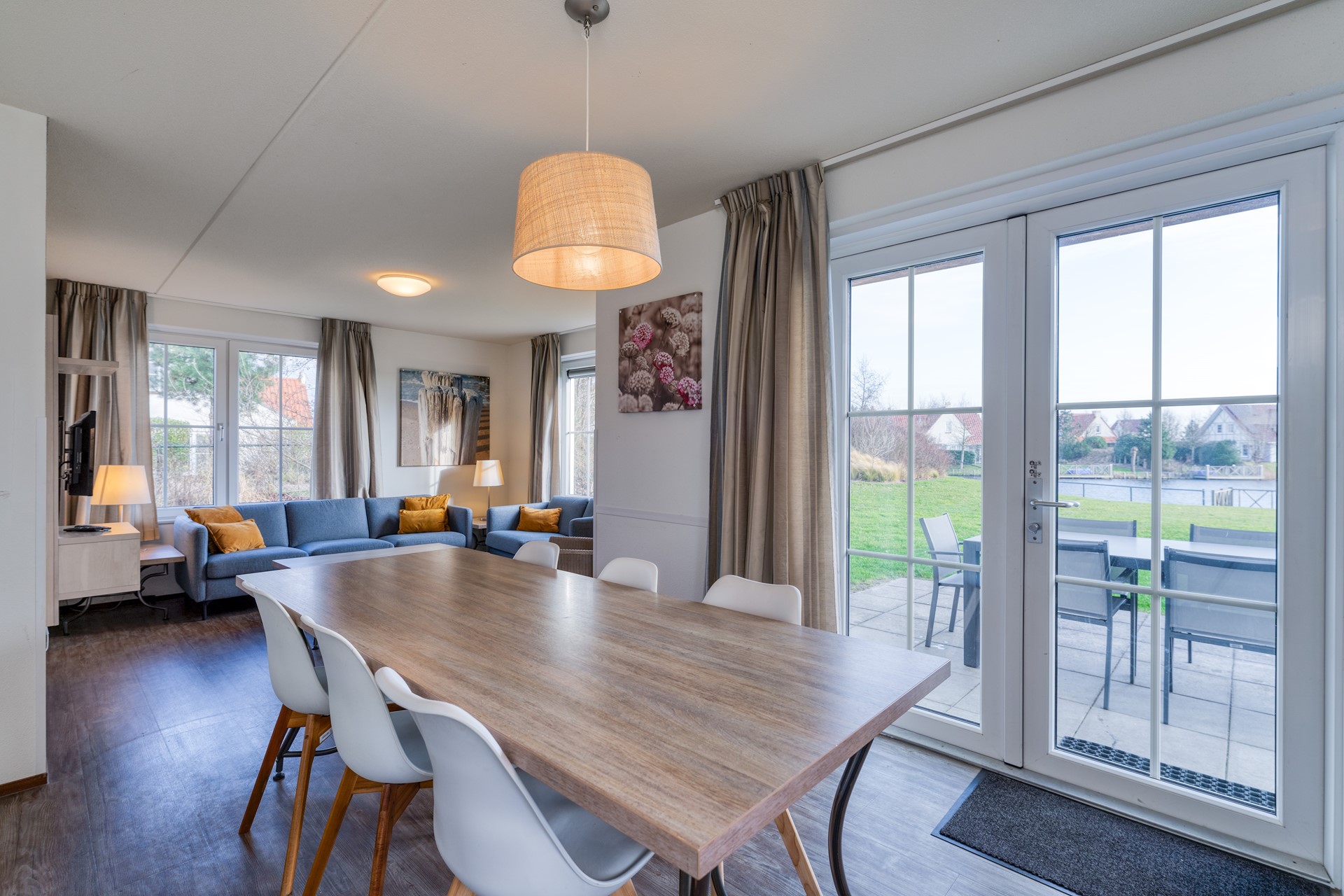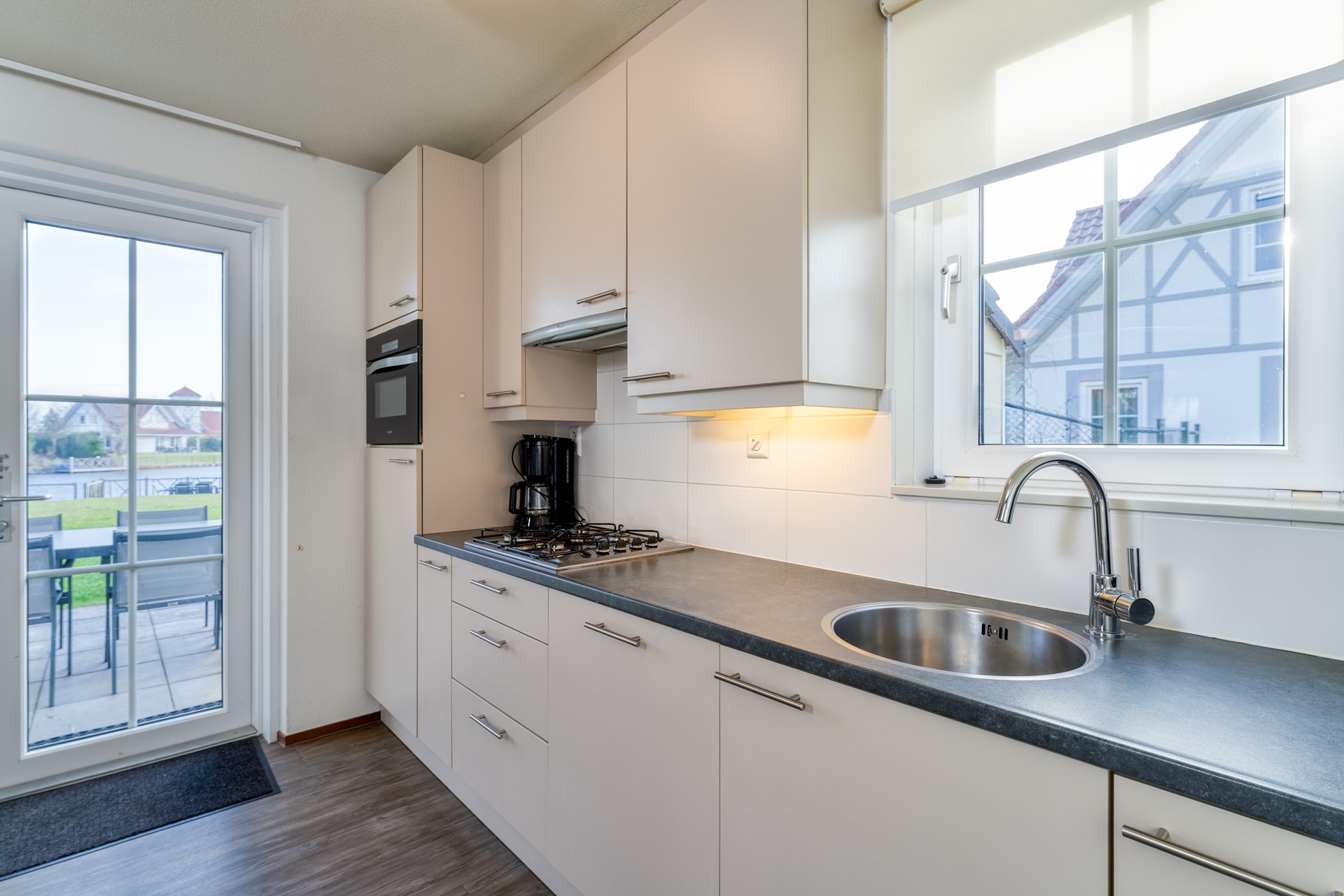 De woonkamer is licht en ruim opgezet en staat in open verbinding met de keuken, waardoor een aangename leefruimte ontstaat met prettige zichtlijnen naar de tuin en het water. De vloer is afgewerkt met een onderhoudsvriendelijke pvc-vloer en draagt bij aan de rustige, verzorgde uitstraling van het interieur. De moderne keuken is compleet uitgevoerd met inbouwapparatuur en biedt volop werk- en kastruimte, geschikt voor zowel dagelijks gebruik als uitgebreid koken. Via de openslaande tuindeuren loopt u direct door naar het overdekte terras, waardoor binnen en buiten op natuurlijke wijze met elkaar worden verbonden.