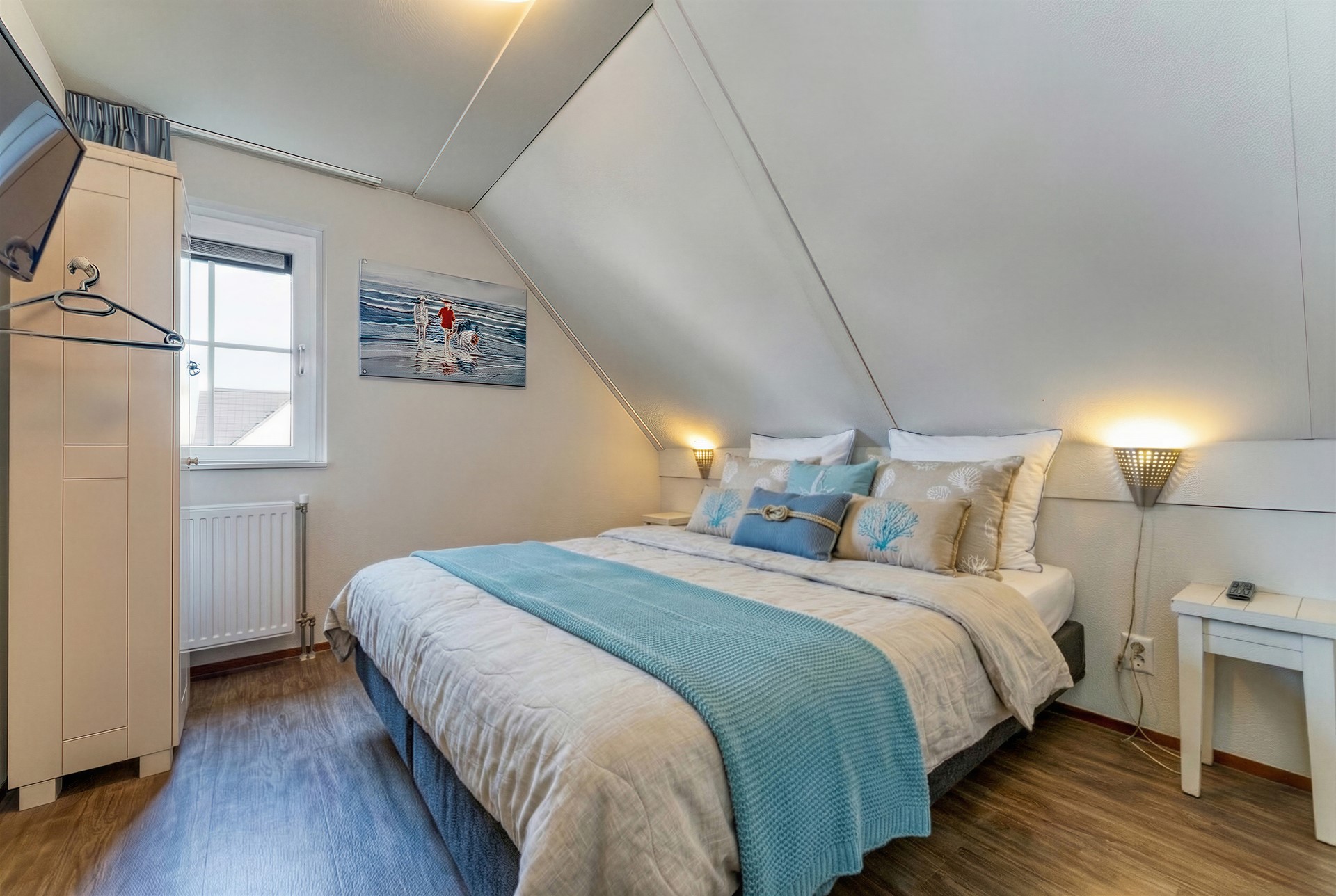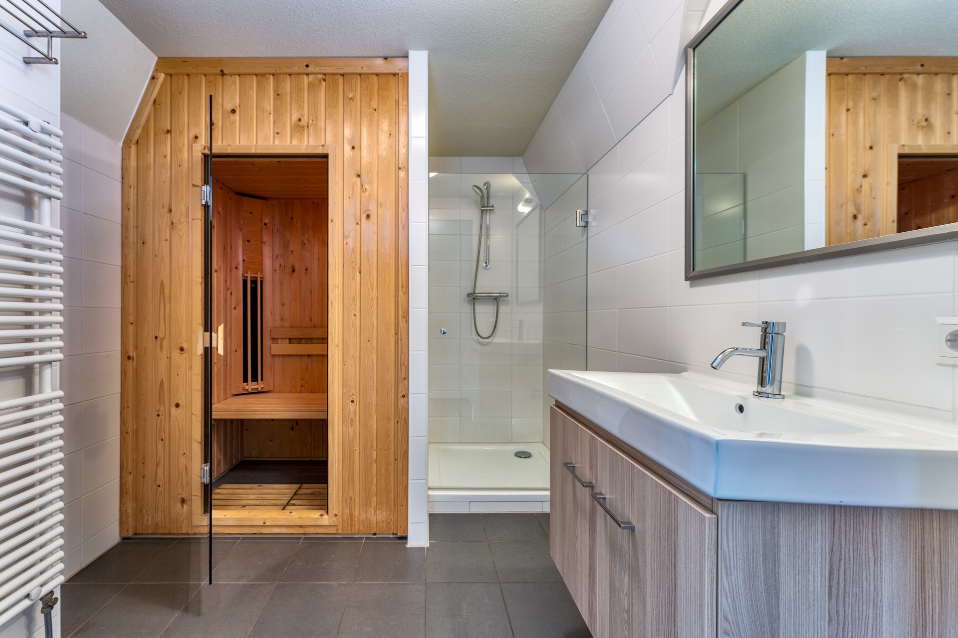 De eerste badkamer is ingericht met een douche, wastafel en sauna, wat deze verdieping een duidelijk wellness-karakter geeft. Een prettige toevoeging voor ontspanning na een stranddag of een lange wandeling in de omgeving. De tweede badkamer beschikt over een ligbad en wastafel en biedt extra comfort en flexibiliteit, zeker bij verblijf met meerdere personen.