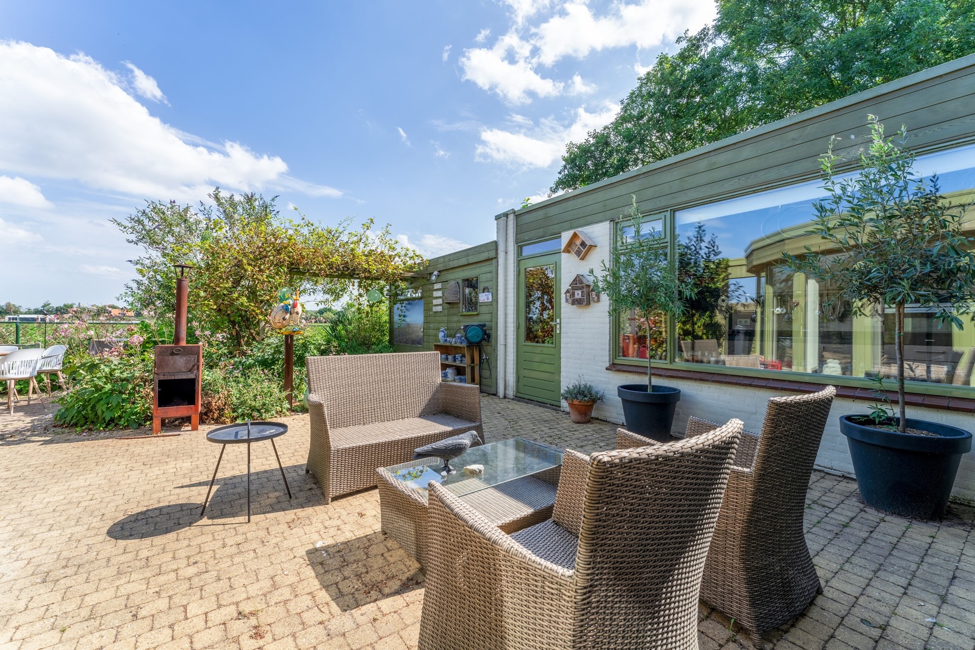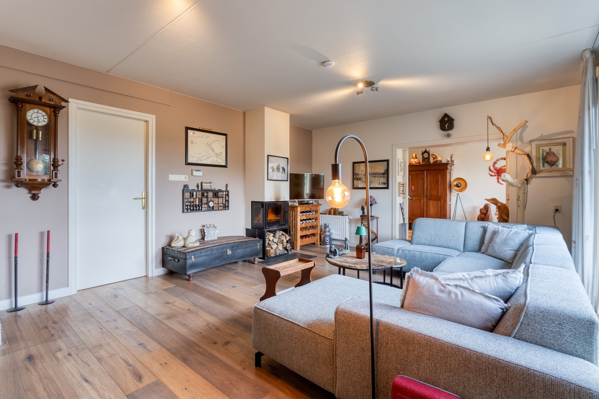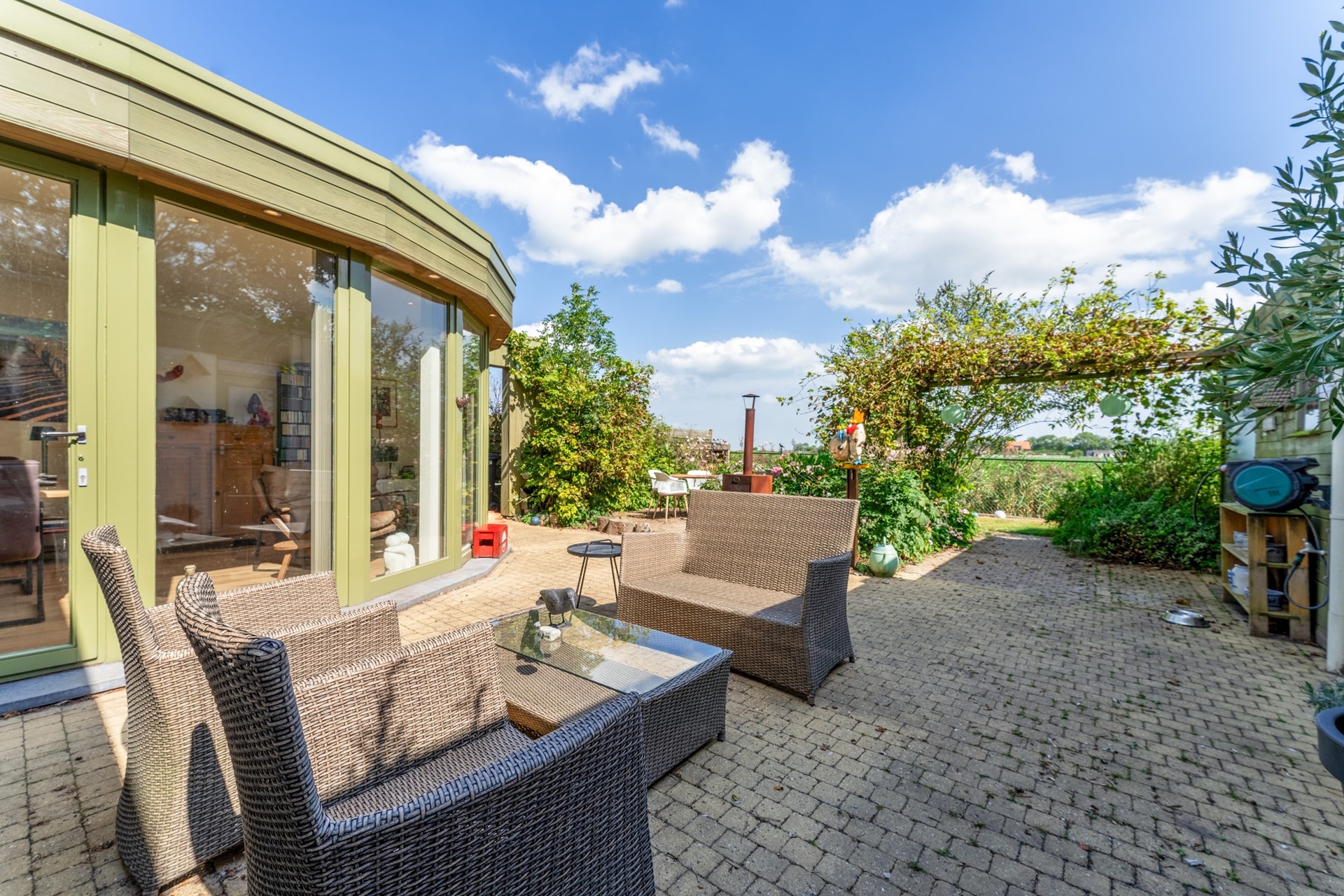 Via en suite deuren bereik je de woonkamer, die – net als de tuinkamer – is voorzien van een warme houten vloer. Een schuifpui verbindt de woonkamer direct met het terras en de tuin, waar het weidse polderlandschap je keer op keer versteld doet staan.