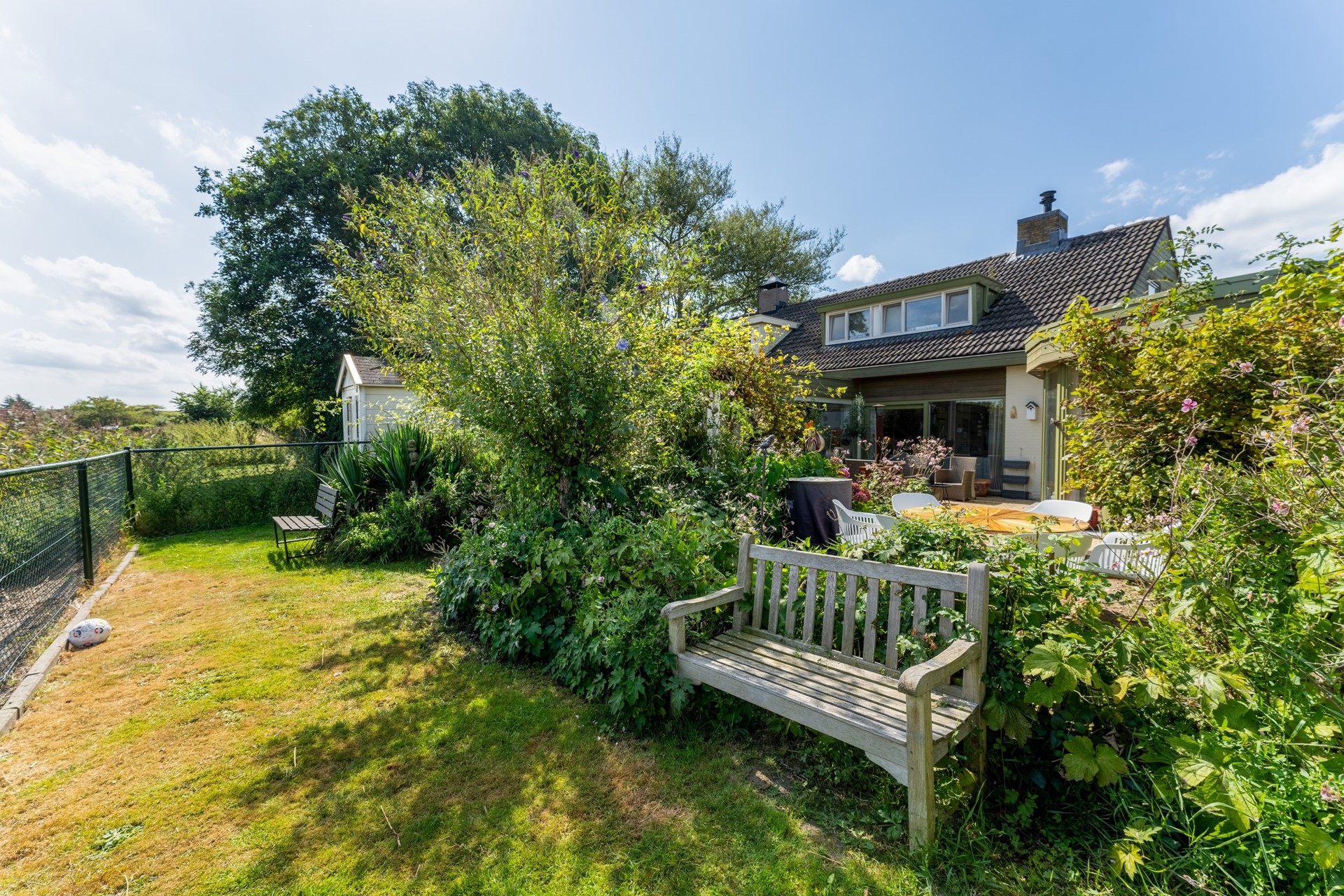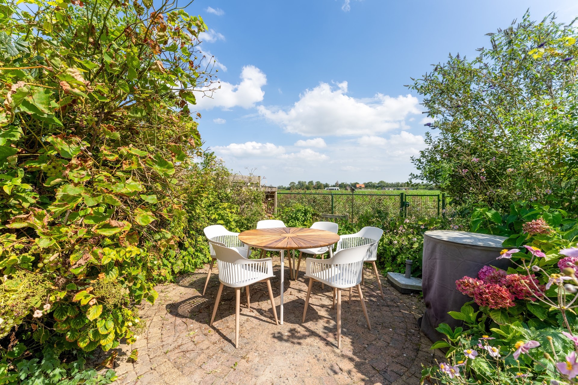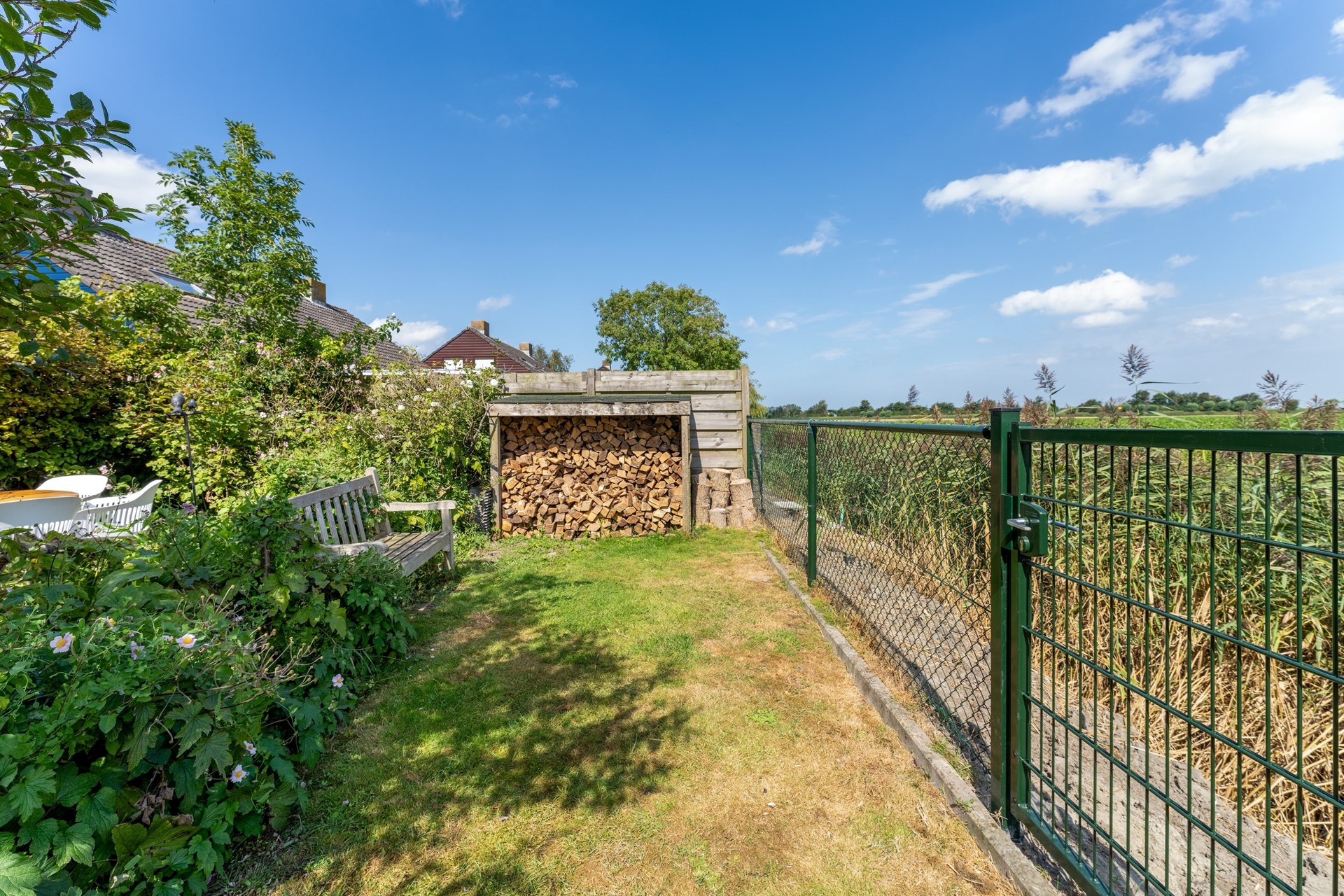 Aan zowel de voor- als achterzijde beschikt de woning over een tuin, samen goed voor een perceel van 383 m². De achtertuin is oostelijk georiënteerd en biedt een schitterend uitzicht over de uitgestrekte landerijen – een heerlijke plek om in alle rust te genieten. Aan de voorzijde is er bovendien ruimte om een oprit of carport te realiseren.