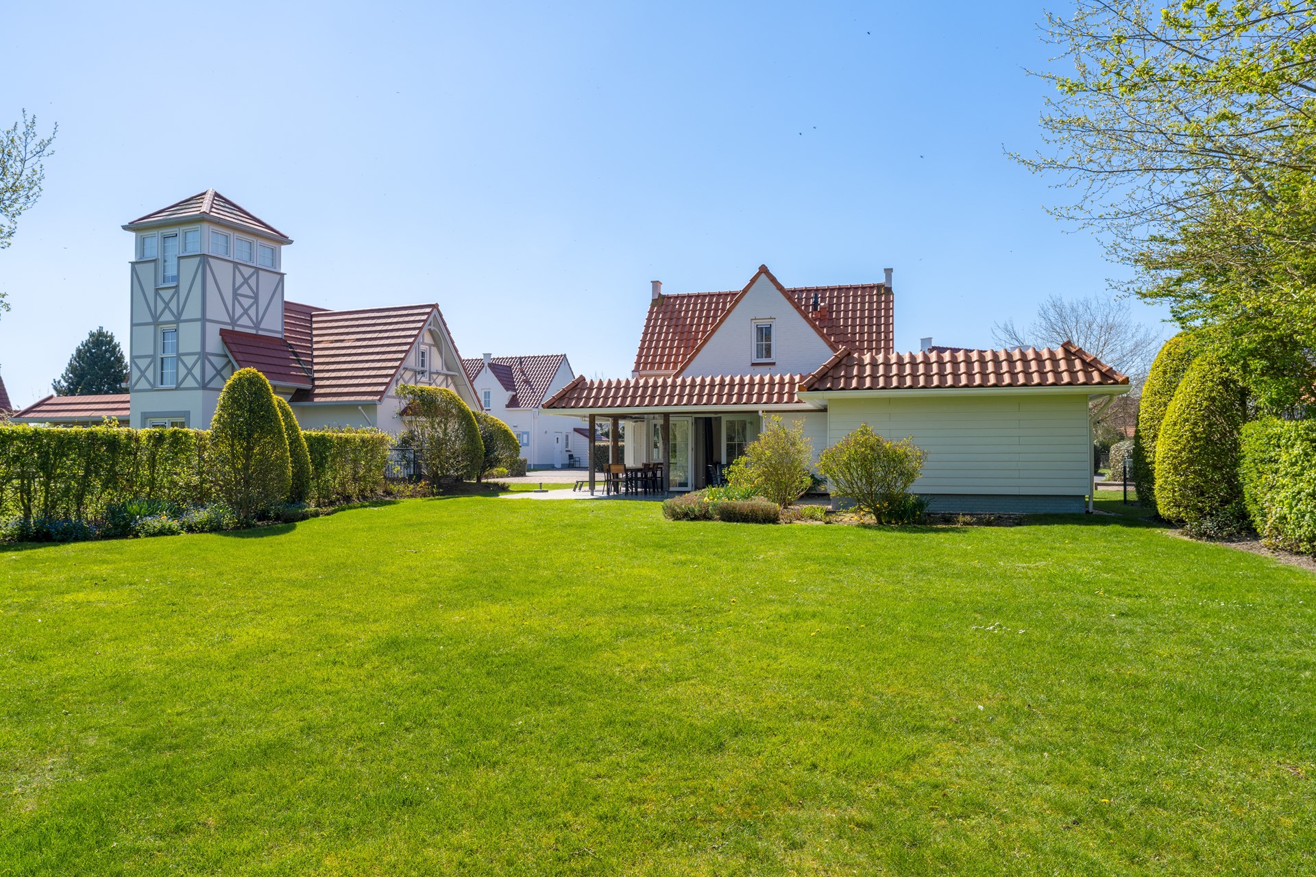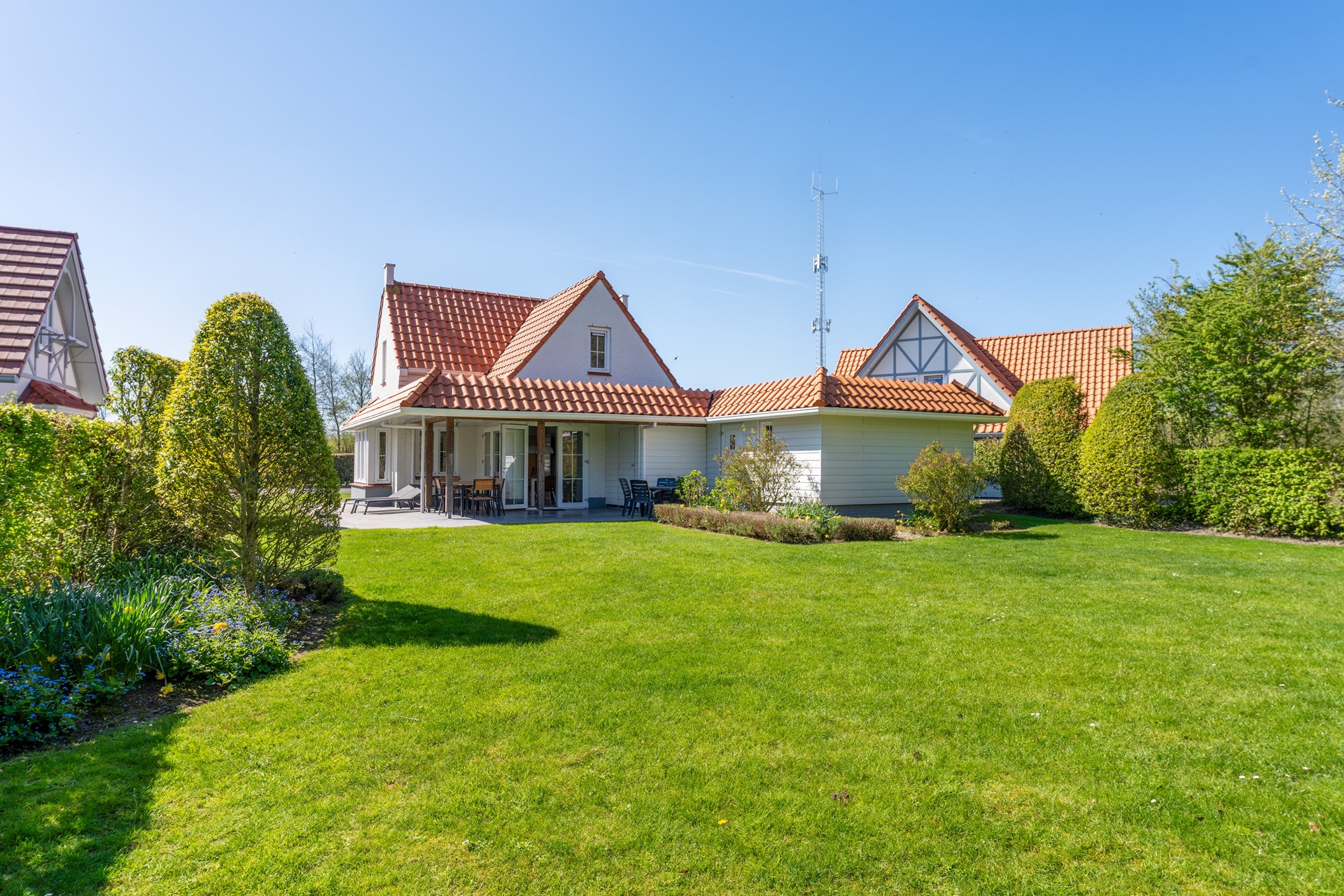 De woning is gelegen aan de rand van Noordzee Résidence Cadzand-Bad, wat zorgt voor extra rust, privacy en een vrij gevoel. Rondom de woning ligt een fraai aangelegde tuin met veel groen en diverse terrassen. Het grote gazon, de beschutte ligging en de royale afstand tot omliggende woningen maken dit een heerlijke plek om te ontspannen.