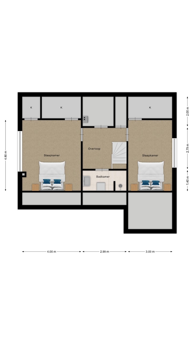 De slaapkamers zijn voorzien van inbouwkasten, en één van de kamers beschikt over rolluiken. Dankzij de royale daklijn is er overal een aangenaam ruimtelijk gevoel.