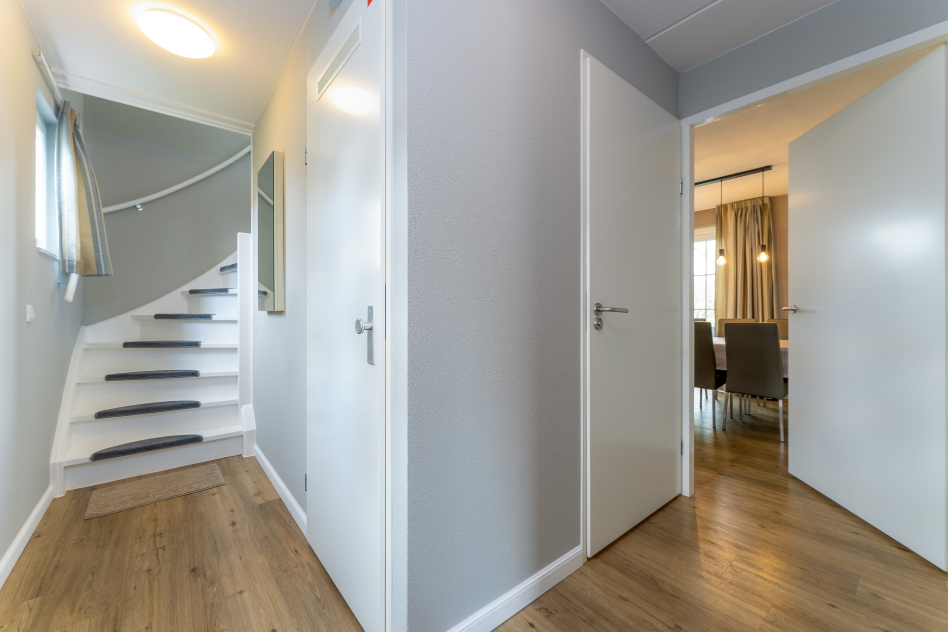 De gehele begane grond is afgewerkt met een stijlvolle pvc-vloer in houtlook voorzien van vloerverwarming, wat zorgt voor een warme uitstraling en extra comfort.