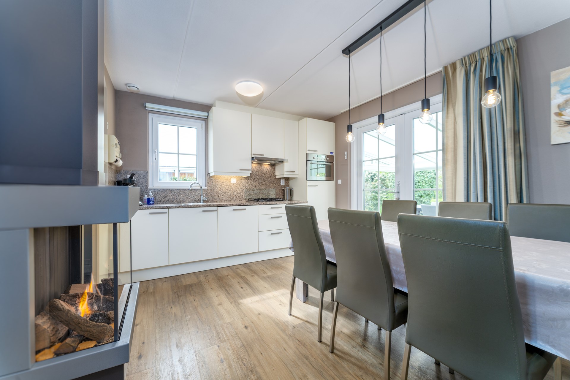 De moderne open keuken is uitgerust met diverse inbouwapparatuur en sluit naadloos aan op de eethoek en woonkamer. Extra sfeer wordt gecreëerd door de sfeervolle gashaard in de keuken, waardoor dit een heerlijke plek is om uitgebreid te tafelen of na te genieten van een dag aan zee.