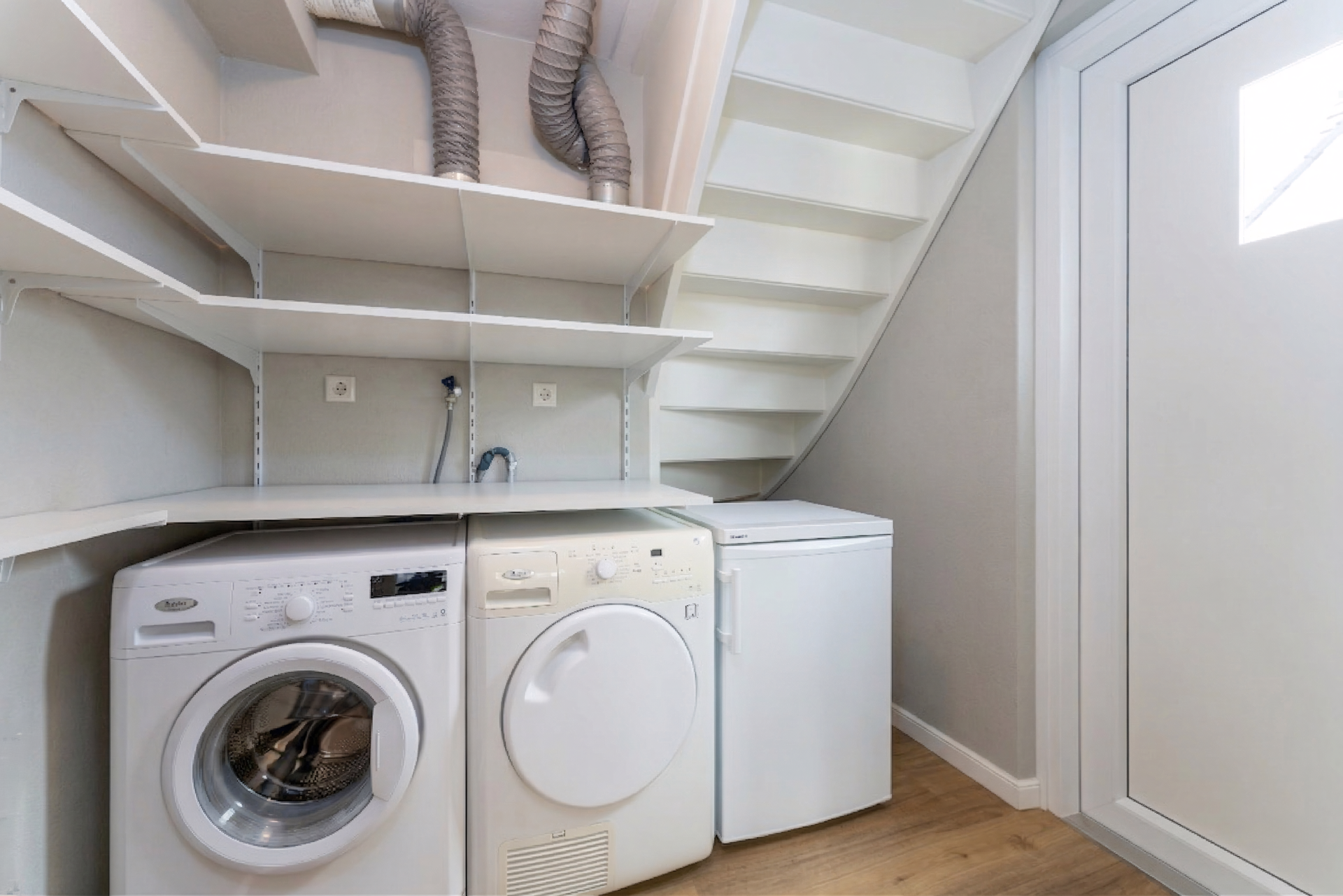 Aansluitend bevindt zich een praktische bijkeuken met witgoedaansluitingen en een tweede entree naar buiten.