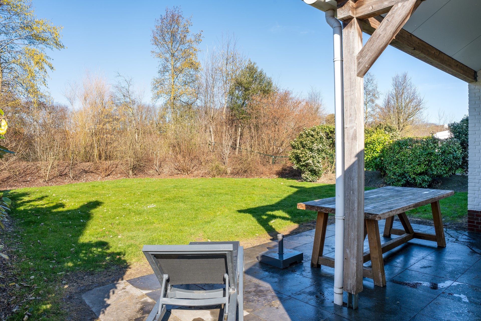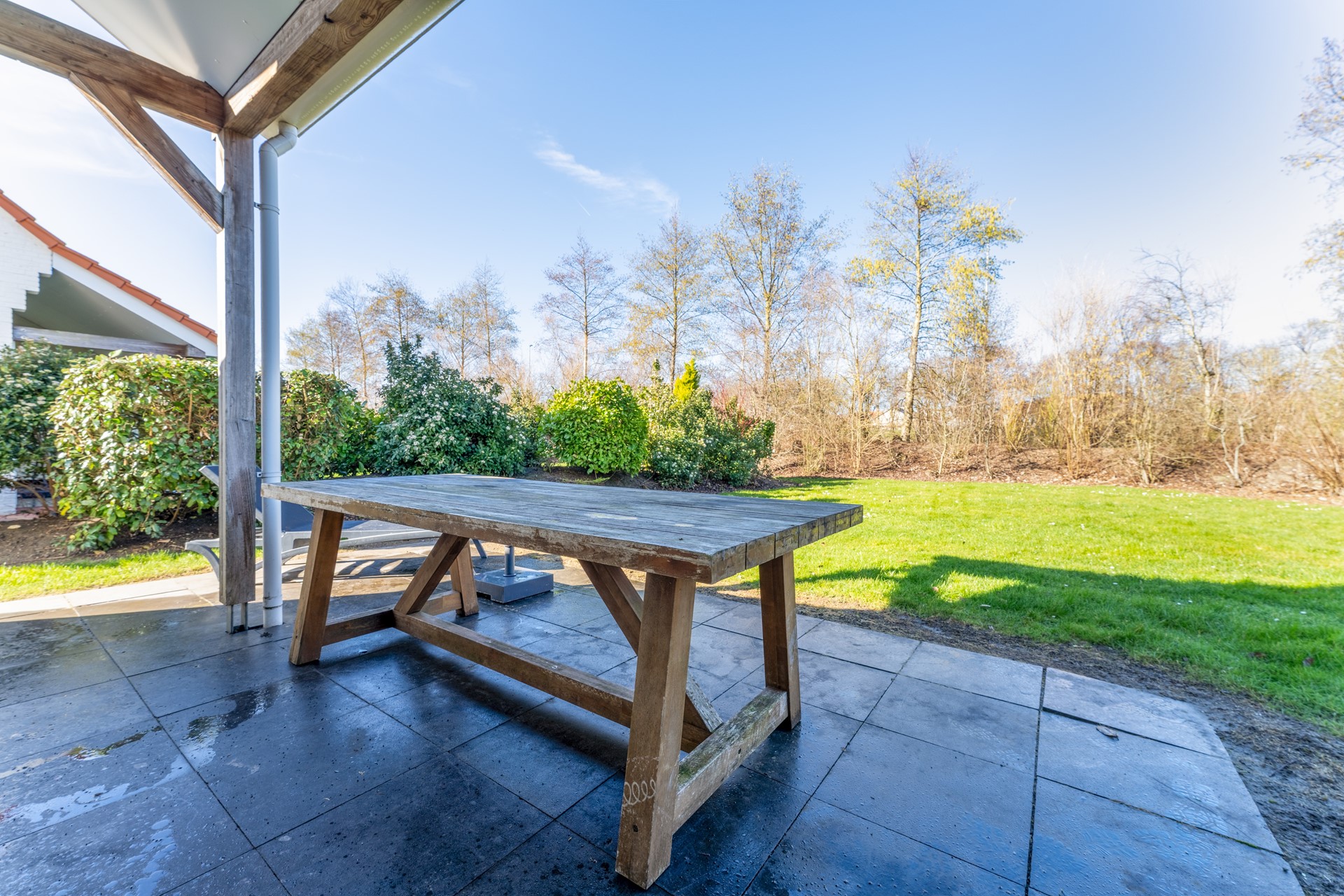 De tuin sluit direct aan op de leefruimte en vormt een natuurlijke verlenging van het woongedeelte. Op eigen terrein is parkeergelegenheid aanwezig.