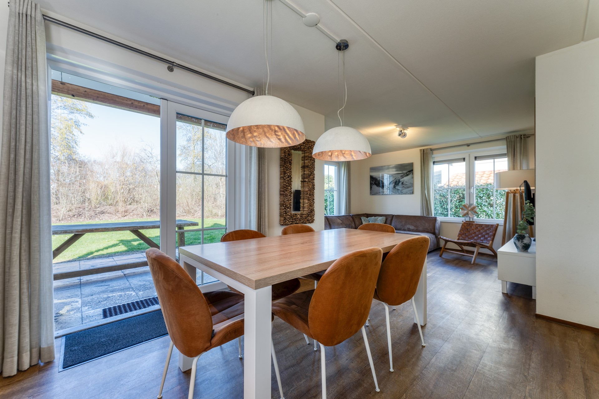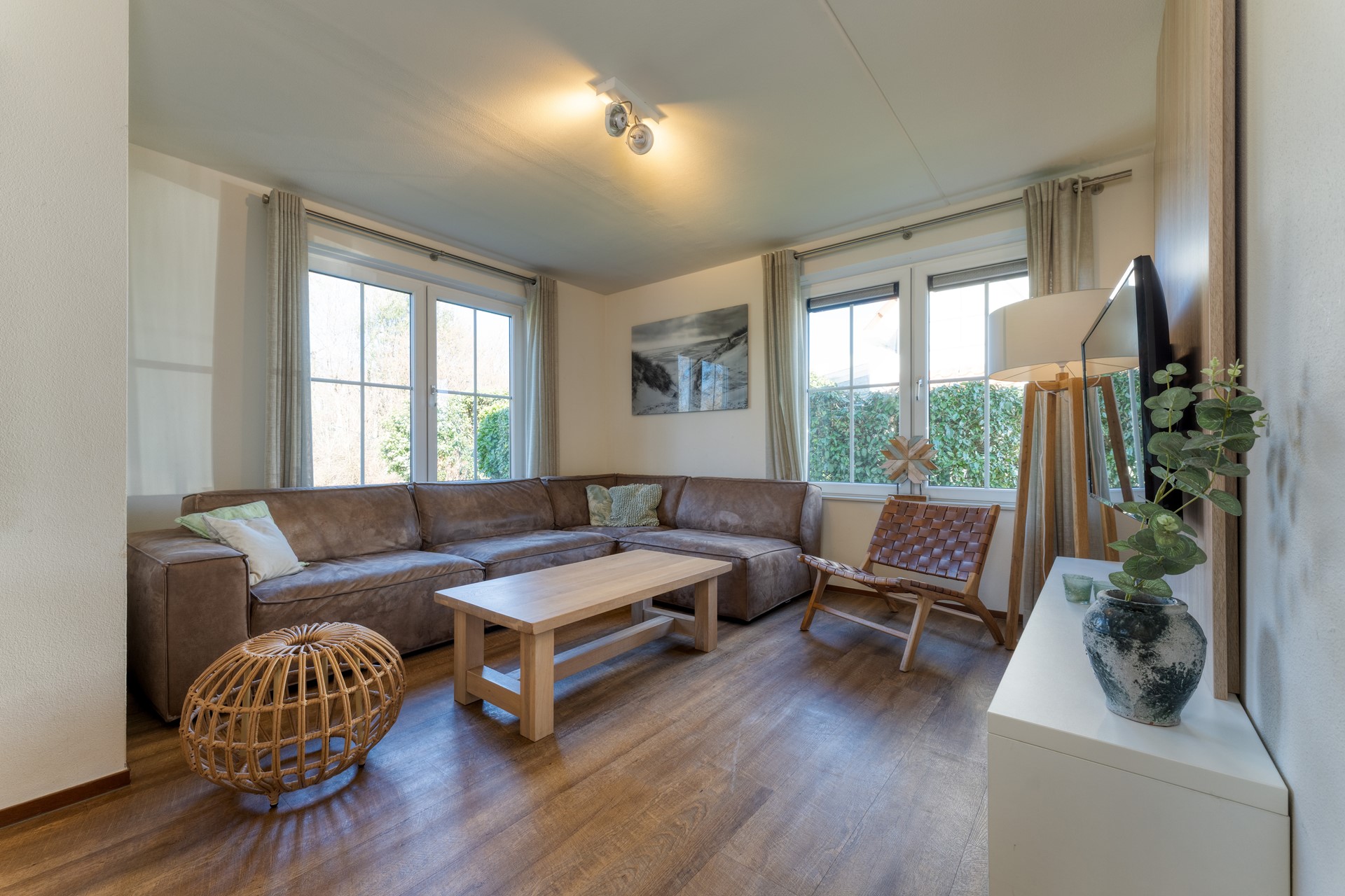 De lichte woonkamer vormt het hart van de woning. Dankzij de grote raampartijen geniet je hier van veel natuurlijke lichtinval en een prettig zicht op de tuin. De open indeling en verzorgde afwerking zorgen voor een rustige, onderhoudsvriendelijke uitstraling die past bij een zorgeloos verblijf aan zee.