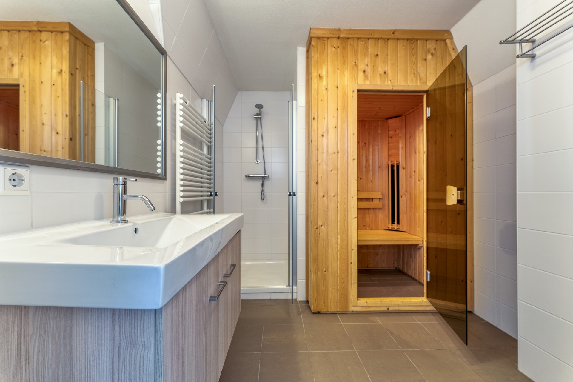 De tweede badkamer beschikt over een inloopdouche, wastafel en een comfortabele infraroodcabine. Deze wellnessvoorziening verhoogt het gebruikscomfort en maakt de woning extra aantrekkelijk voor recreatieve gasten.