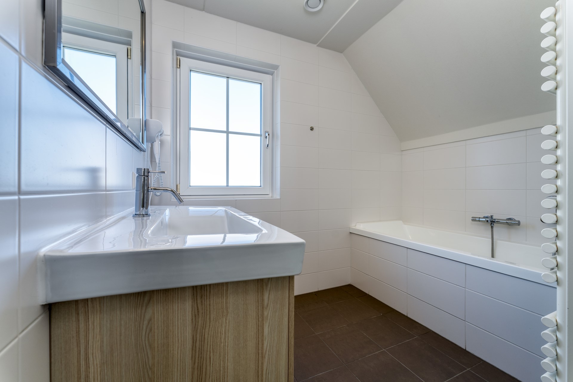 De eerste badkamer is uitgerust met een ligbad en wastafel — een fijne plek om na een dag aan zee volledig te ontspannen.