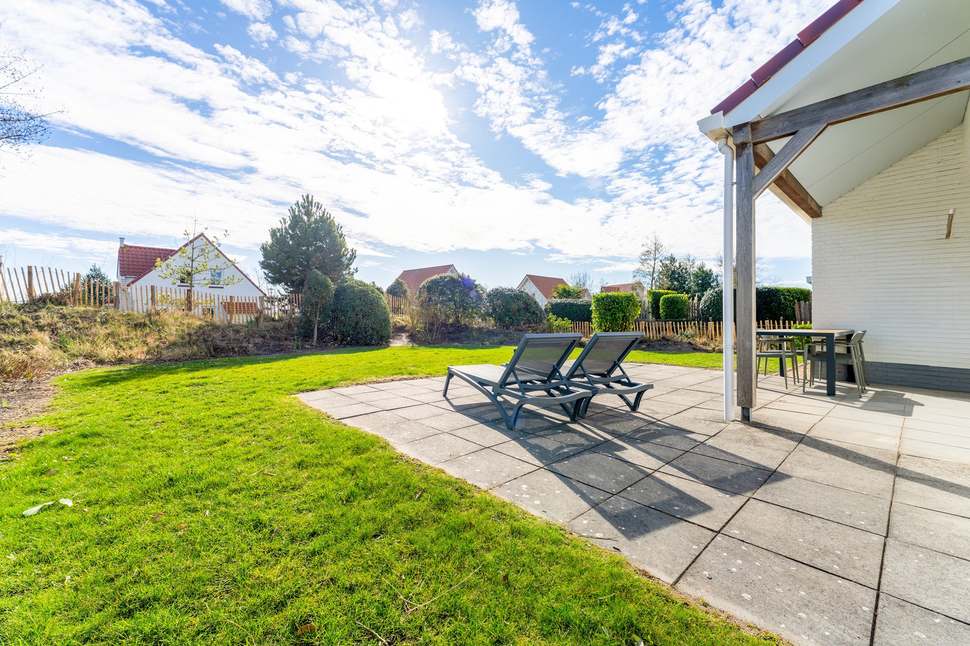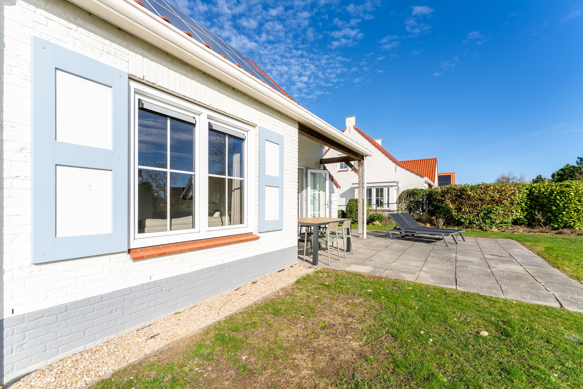 Rondom de woning ligt een fraai aangelegde, met gras ingezaaide tuin met een gunstige zuidoostelijke ligging, waardoor je volop van de ochtend- en middagzon kunt genieten. Direct grenzend aan de woning bevindt zich een ruim terras met een stijlvolle terrasoverkapping – de ideale plek om ook tijdens koelere avonden comfortabel buiten te zitten. De groene beplanting zorgt voor een serene en verzorgde uitstraling. Aan de woning is een praktische berging aanwezig, perfect voor het opbergen van fietsen, tuingereedschap of strandspullen. Bovendien biedt de oprit ruimte voor twee auto’s op eigen terrein – wel zo handig!