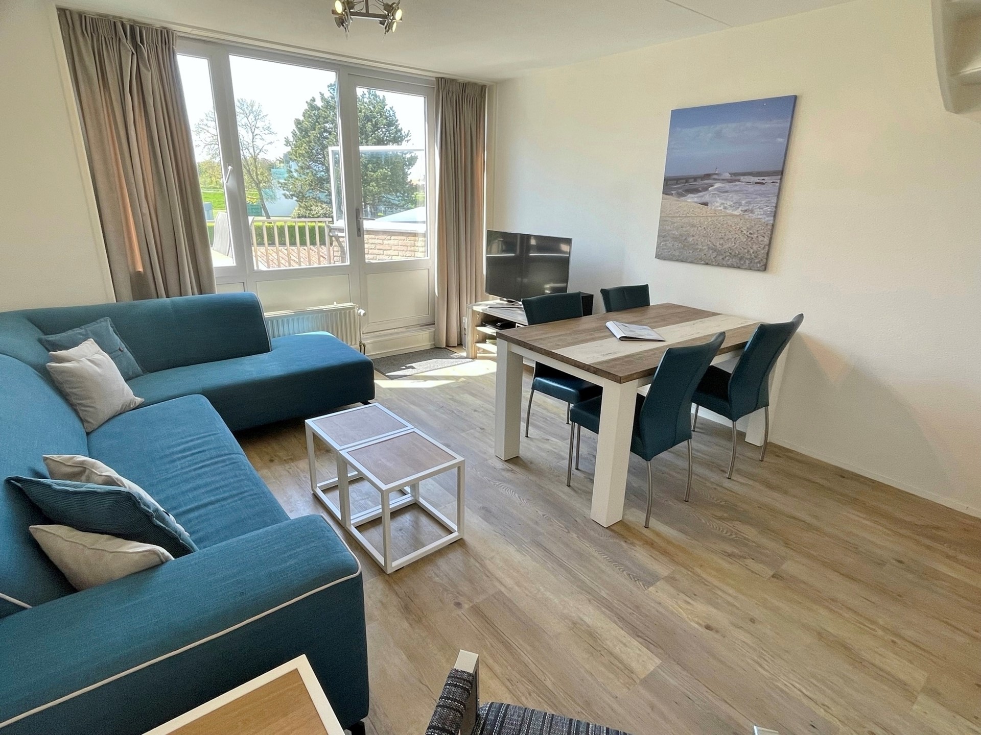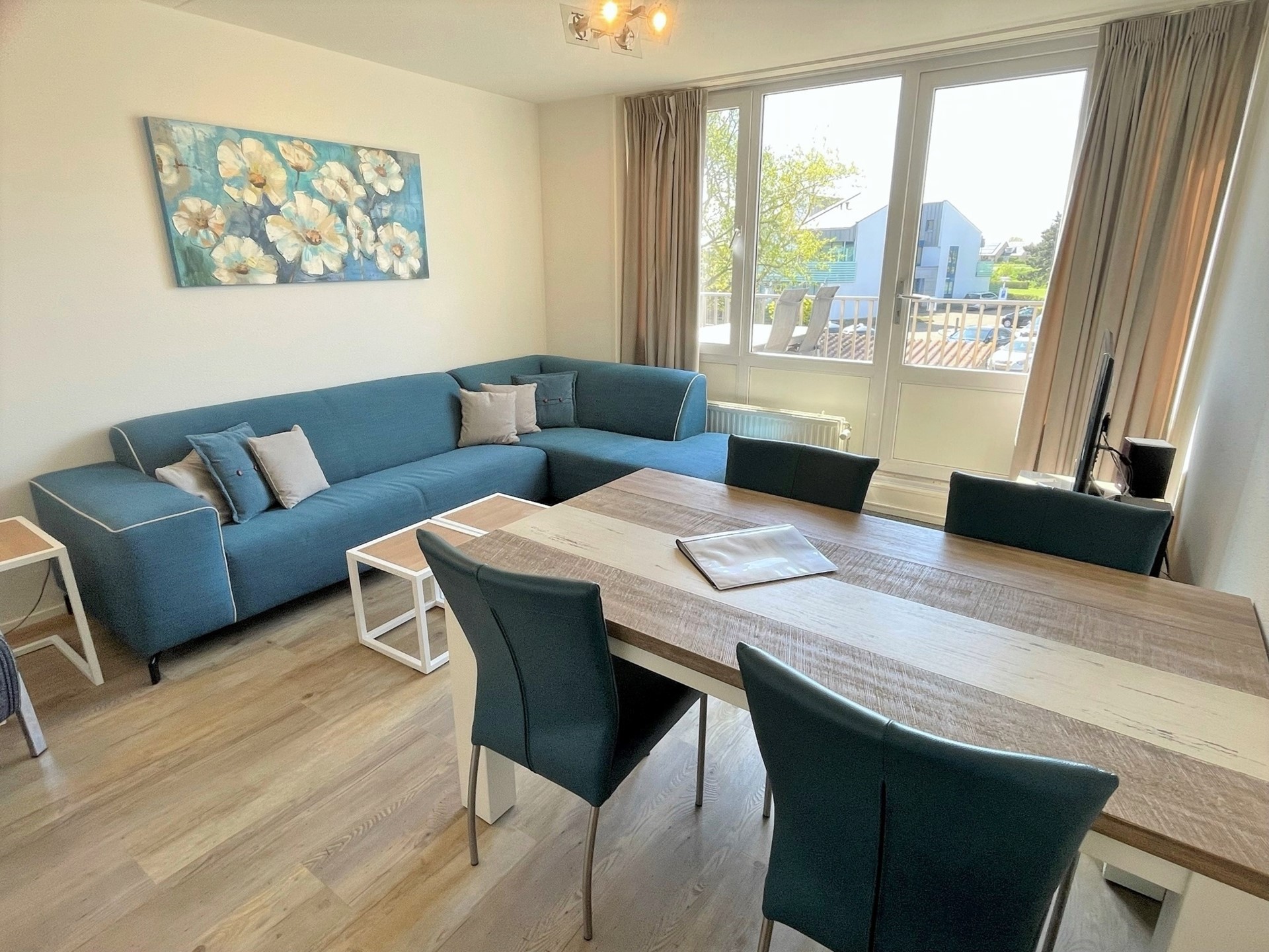 De woonkamer is heerlijk licht dankzij de grote ramen en heeft een deur naar het balkon op het westen. Dit balkon (ca. 9,5 m²) is vergroot, zodat er genoeg ruimte is om met meerdere personen comfortabel te zitten.