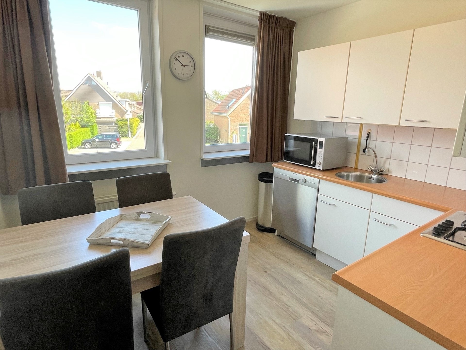 De keuken is compleet uitgerust met een 4-pits gaskookplaat, afzuigkap, spoelbak, koelkast met vriesvak, vaatwasmachine en losse magnetron. De badkamer is voorzien van een douche, wastafel en toilet.