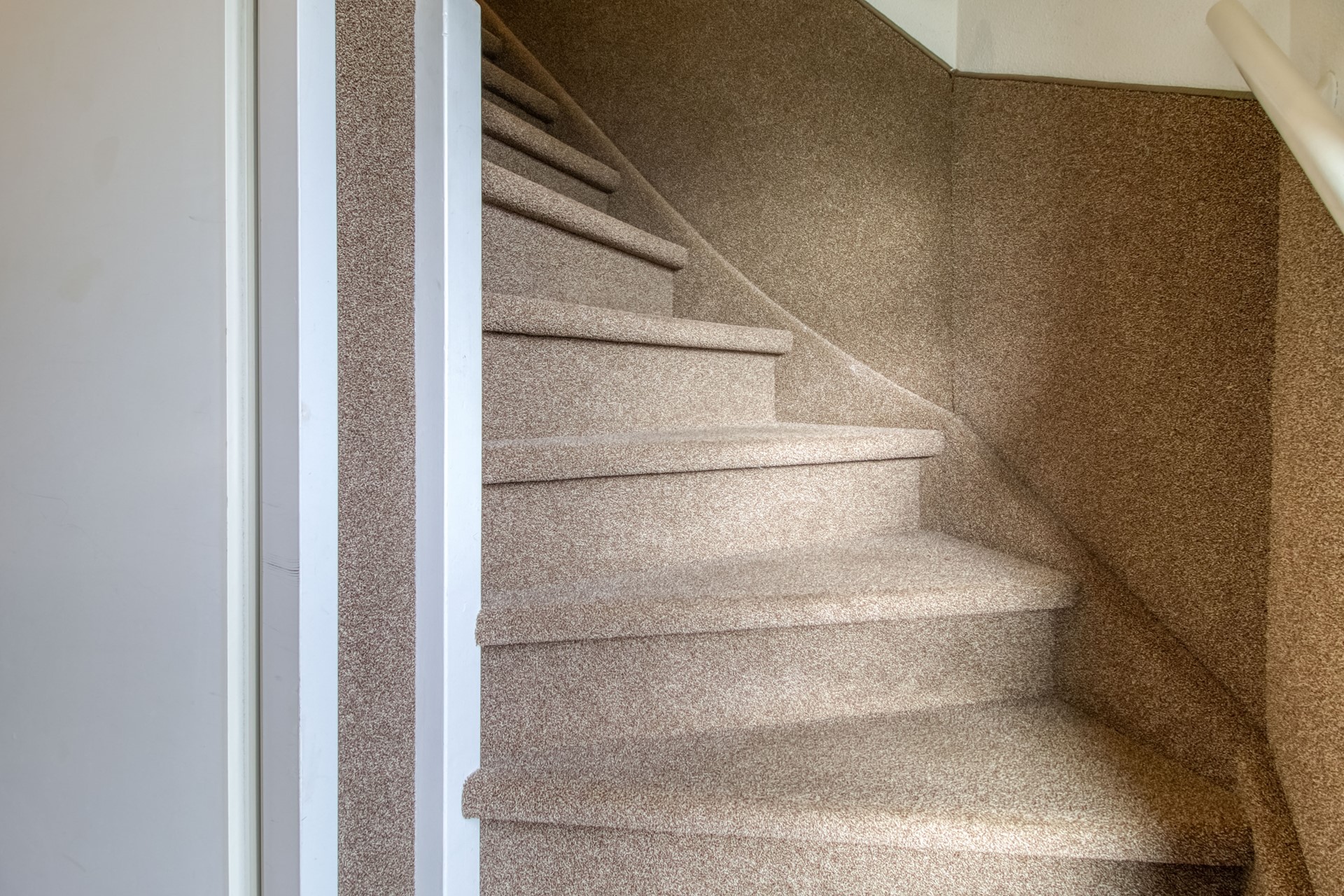 Je komt binnen in de centrale hal met de meterkast, de deur naar het appartement op de begane grond en de trap naar de eerste verdieping waar zich het tweede appartement bevindt.