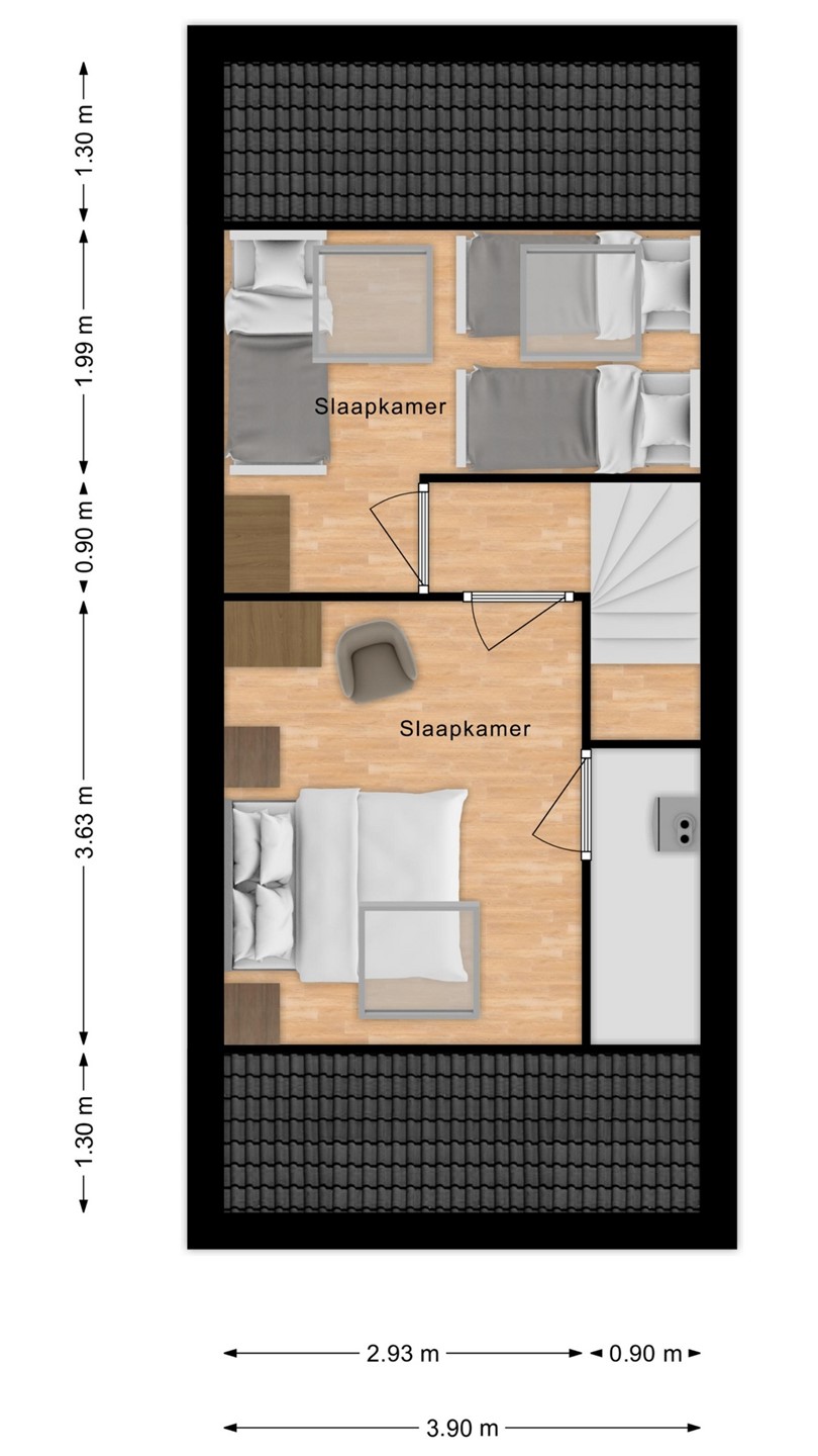Op deze verdieping bevinden zich twee slaapkamers, beide voorzien van Veluxramen die geopend en verduisterd kunnen worden. In één van de slaapkamers is er een deur naar een praktische berging, waar de verwarmingsketel en de wasmachine staan opgesteld.