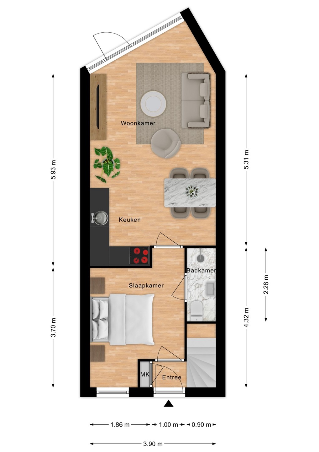 Vanuit de slaapkamer loop je door naar de lichte woonkamer met open keuken en toegang tot het terras aan de achterzijde. Je kunt het appartement ook direct via deze terrasdeur binnengaan.