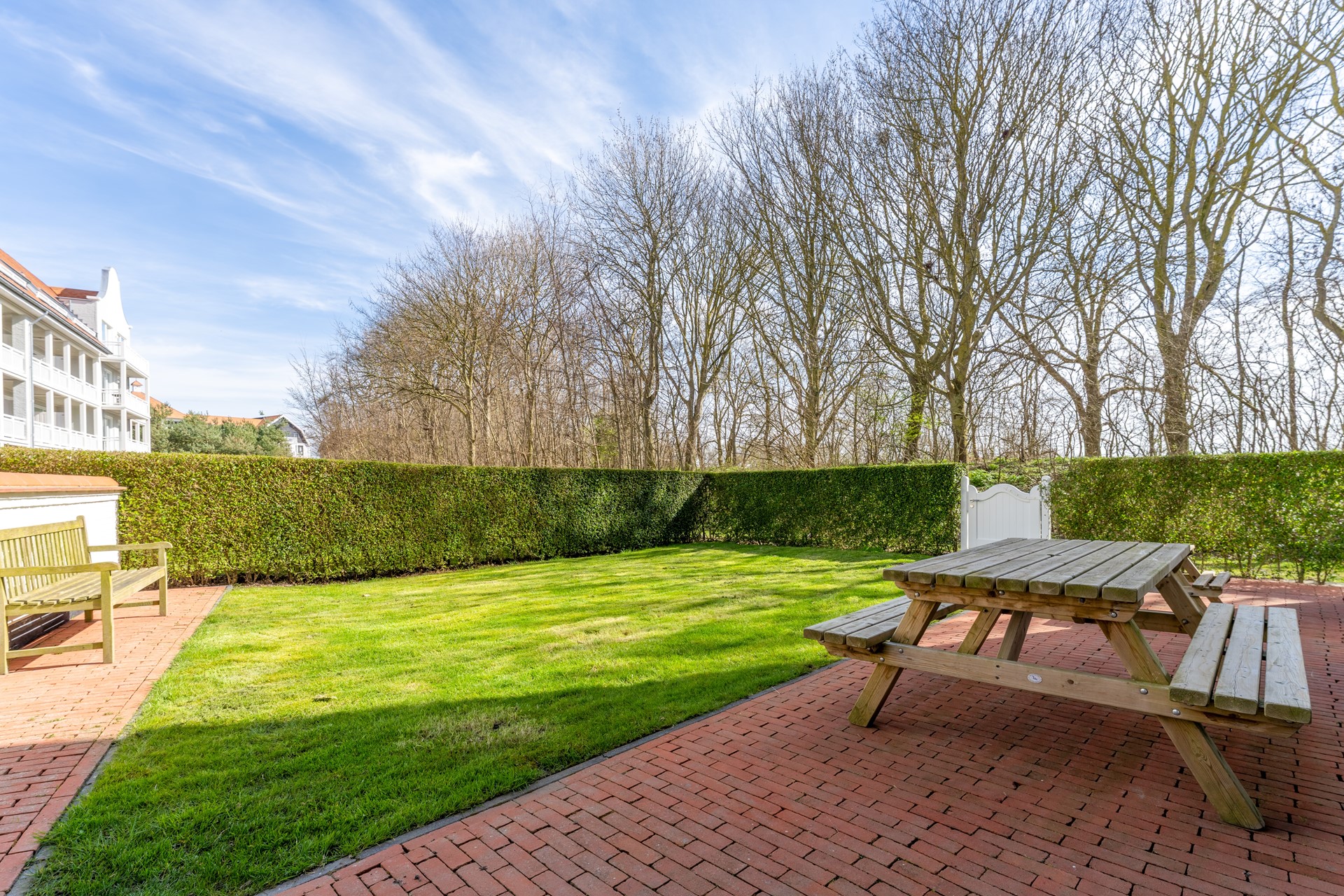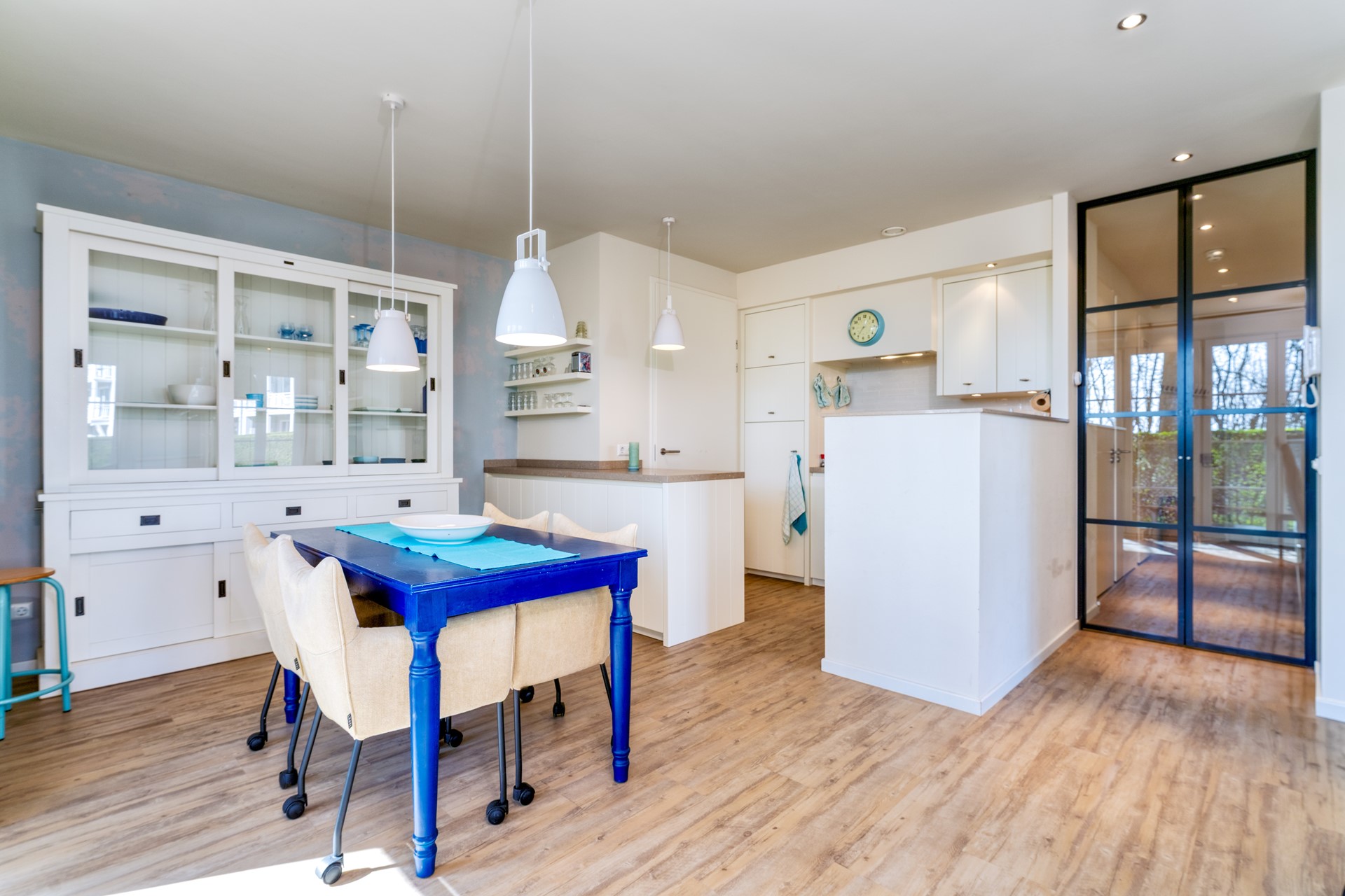Ideaal gelegen op de begane grond vinden we dit luxe appartement. Bij binnenkomst in de hal heb je toegang tot alle vertrekken van de woning. De gehele inrichting straalt direct het strandgevoel uit en is voorzien van een nette PVC-vloer die door het appartement loopt. Middels openslaande glazen deuren bereiken we de royale woonkamer, die zowel sfeervol als licht is. De vele openslaande deuren zorgen voor prachtig lichtinval en geven toegang tot de aangrenzende tuin. De tuin, op het oosten georiënteerd, biedt zowel ruimte als privacy en is de perfecte plek om 's ochtends de dag te beginnen met een goede kop koffie.