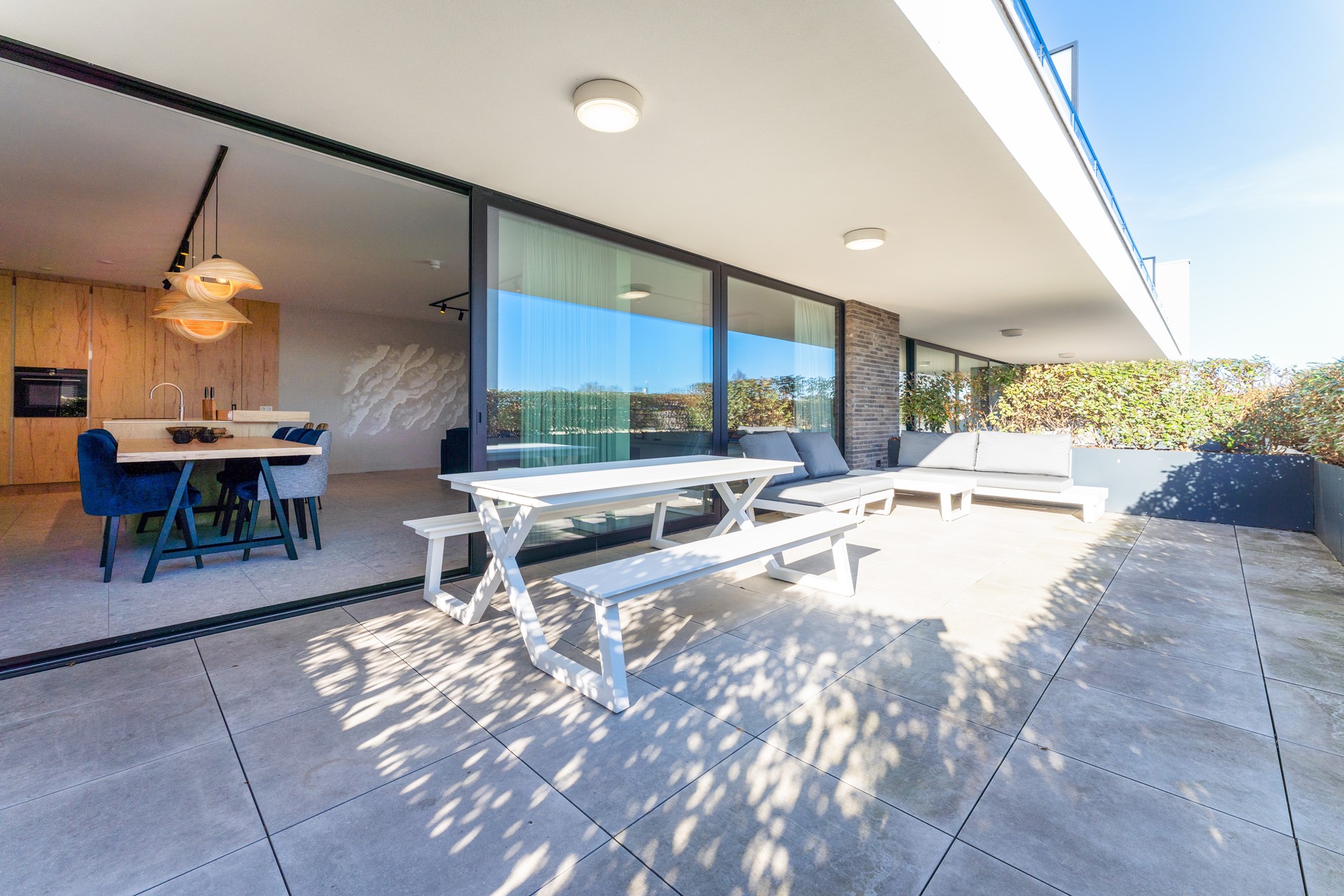 Een absolute eyecatcher is de brede raampartij over de volledige breedte van de woning, die niet alleen zorgt voor een overvloed aan natuurlijk licht, maar ook leidt naar het royale, op het zuidoosten gelegen terras van maar liefst 43 m² – de perfecte plek om de dag te beginnen met een koffie of te eindigen met een goed glas wijn in de zon.