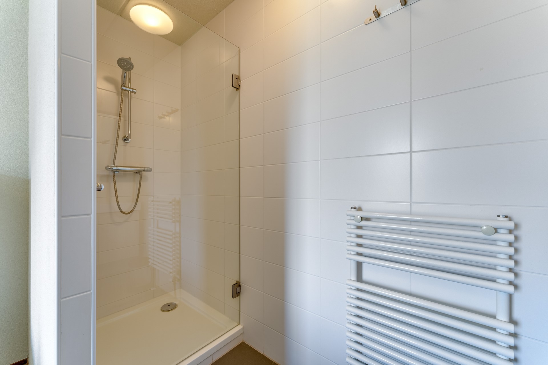 De bovenverdieping verrast met zijn royale indeling en comfortabele sfeer. Via een ruime overloop heb je toegang tot twee fijne slaapkamers, een apart toilet en een moderne, stijlvol afgewerkte badkamer met inloopdouche, glazen wand, wastafelmeubel en handdoekradiator. De grootste slaapkamer beschikt bovendien over een handige privékast – ideaal voor het netjes opbergen van kleding en persoonlijke bezittingen.