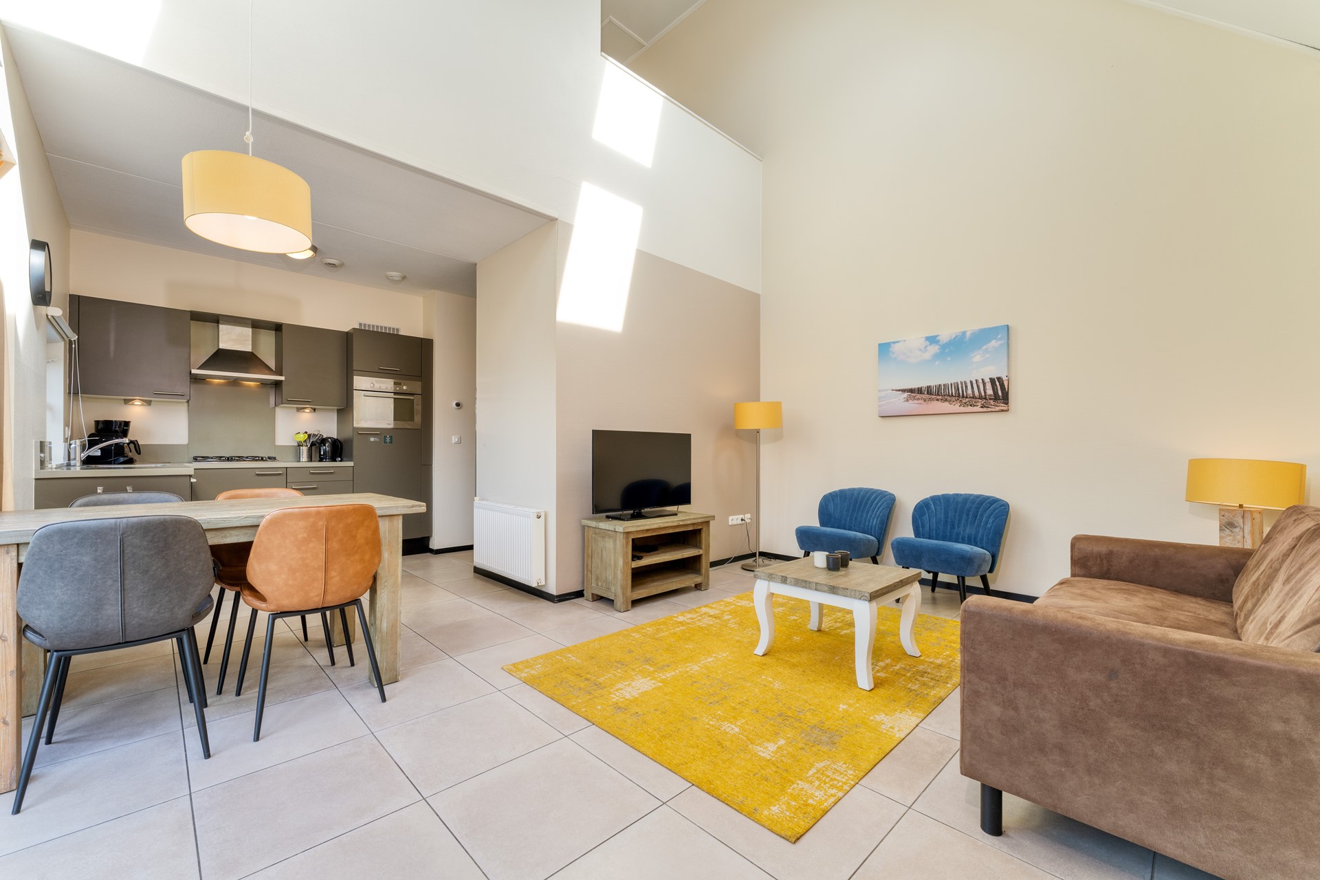 De woonkamer staat in open verbinding met de moderne keuken in hoekopstelling, welke is voorzien van diverse geïntegreerde inbouwapparatuur en alle benodigde gemakken voor een comfortabel verblijf.