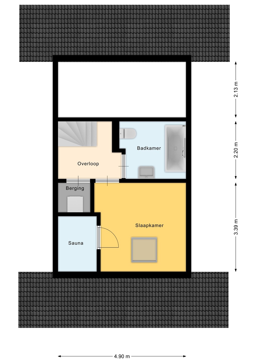 Middels de trapopgang bereikt u de overloop. Vanaf hier heeft u toegang tot een ruime slaapkamer met sauna, ideaal voor ontspanning na een dag aan zee.