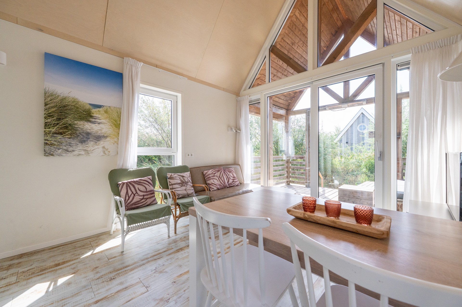 De woonkamer ademt licht en ruimte dankzij de hoge kap en de glazen pui tot in de nok. Openslaande deuren verbinden de leefruimte met de veranda op het zuiden. Hier zit je beschut onder de kapconstructie, met een vaste loungebank en terrasheater.