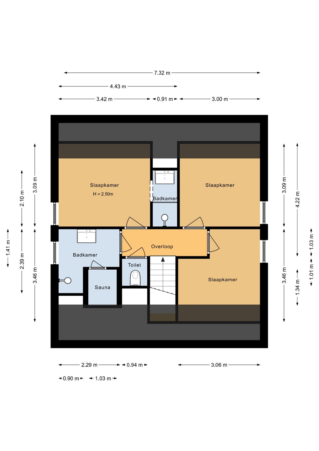 Daarnaast bevindt zich op deze verdieping een derde, volwaardige badkamer. Deze ruimte is uitgerust met een douche, een heerlijke sauna en een stijlvol wastafelmeubel. De sauna maakt deze verdieping tot een echte wellnessoase, perfect om tot rust te komen na een strandwandeling of actieve dag in de omgeving. Een tweede separaat toilet op de overloop maakt het geheel compleet en verhoogt het gebruiksgemak voor zowel bewoners als gasten.