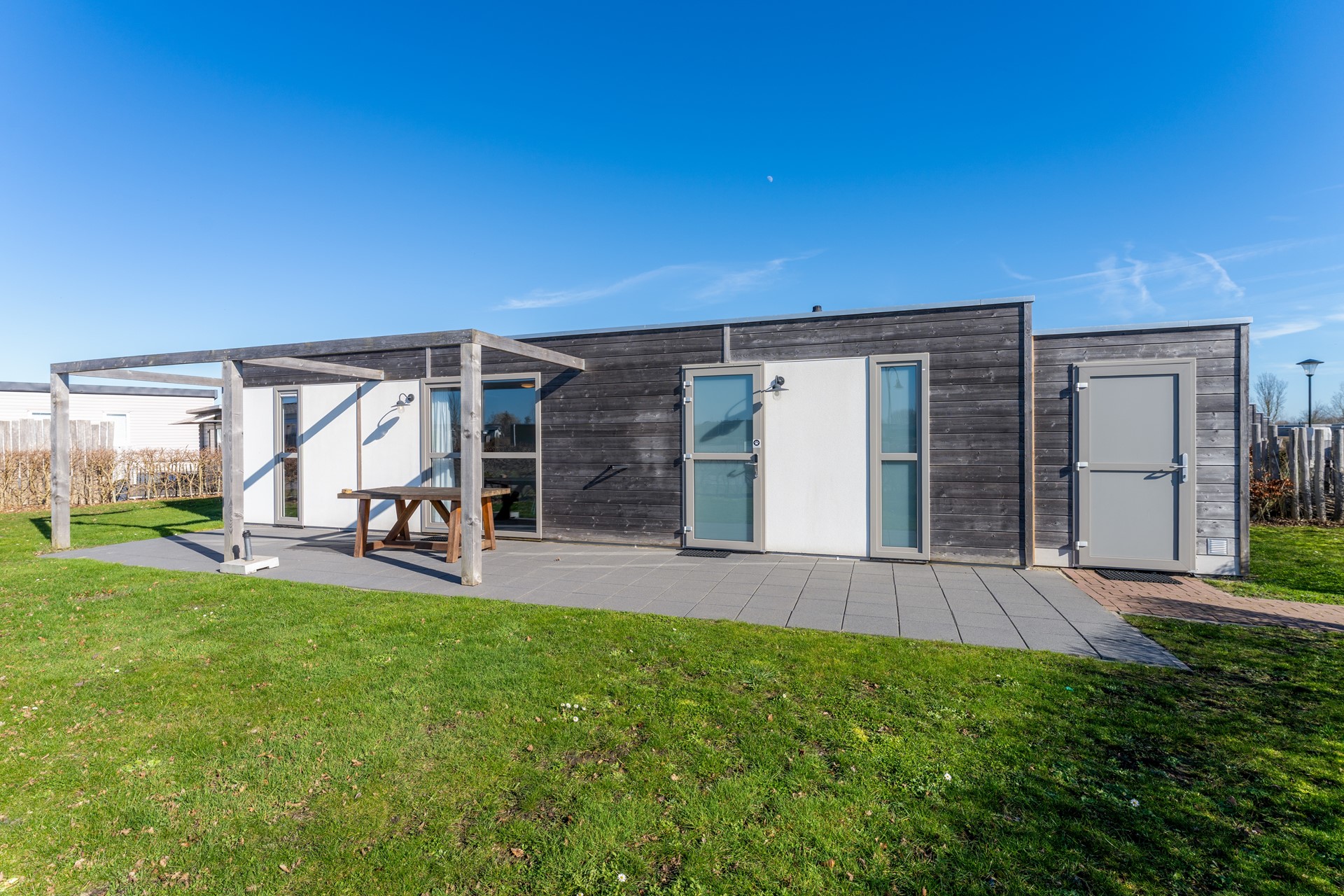 De woning is gebouwd in 2019 en uitgevoerd in houtskeletbouw, afgewerkt met sierpleister en houten rabatdelen. De architectuur is eigentijds en strak, passend binnen het moderne parkconcept. Het terras is gesitueerd op het zuidwesten, waardoor je hier volop van de middag- en avondzon kunt genieten.
