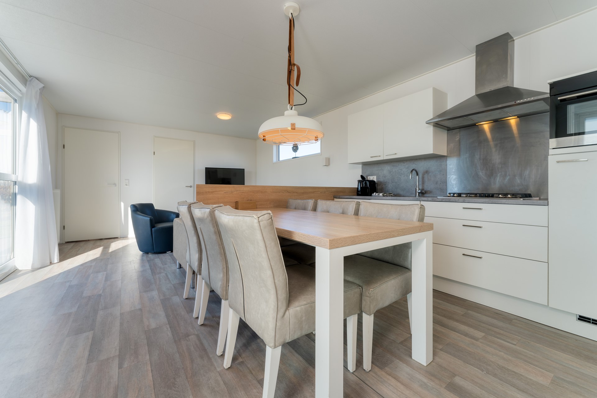 De woonkamer vormt het centrale hart van de woning en is voorzien van een schuifpui naar het terras. Hierdoor ontstaat een prettige verbinding tussen binnen en buiten. Er is voldoende ruimte voor een zithoek en eettafel, passend bij een 6-persoonsbezetting.