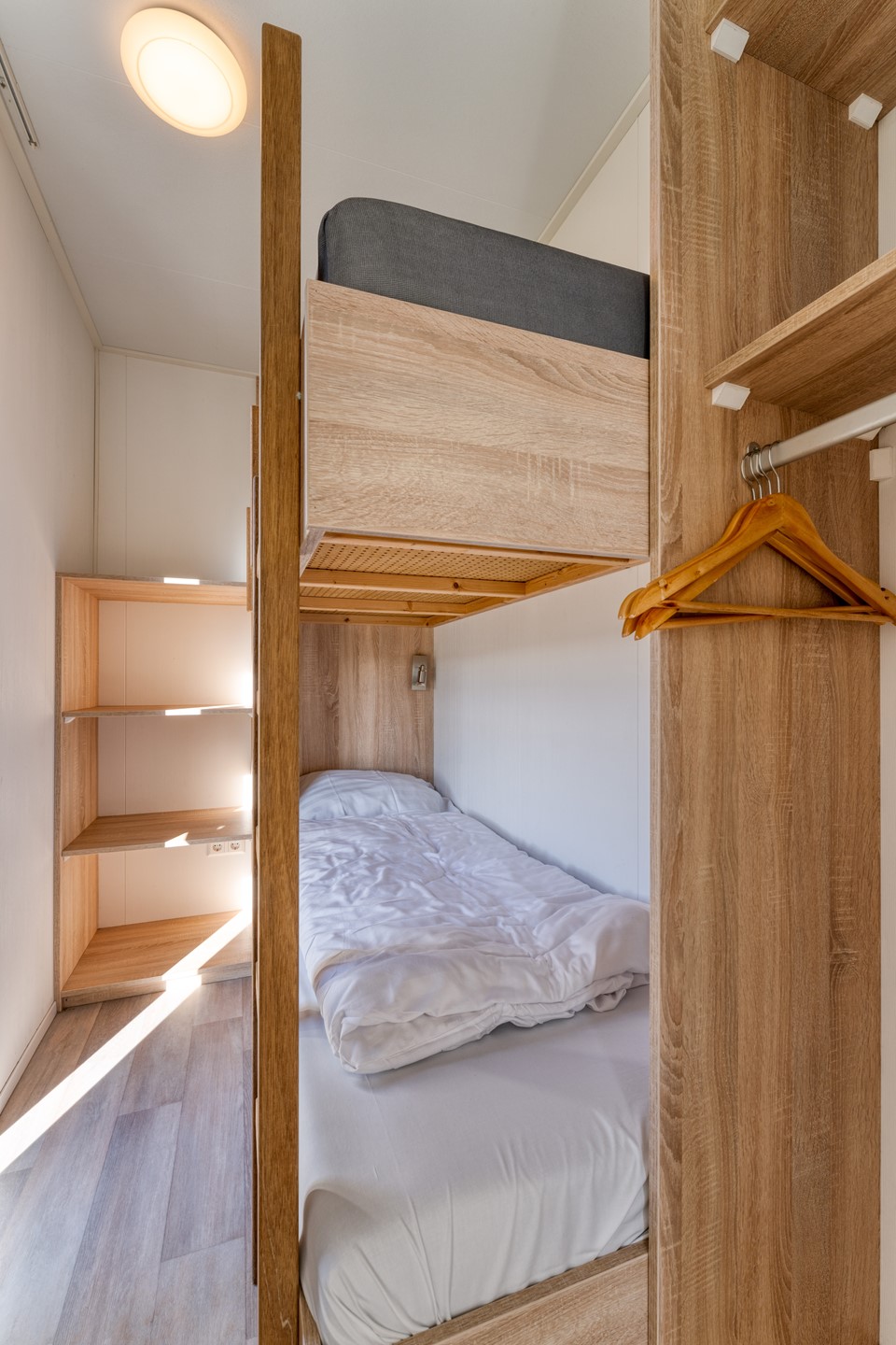 De woning beschikt over drie slaapkamers, waarvan één met stapelbed. De badkamer is voorzien van een douche, wastafelmeubel en handdoekradiator.