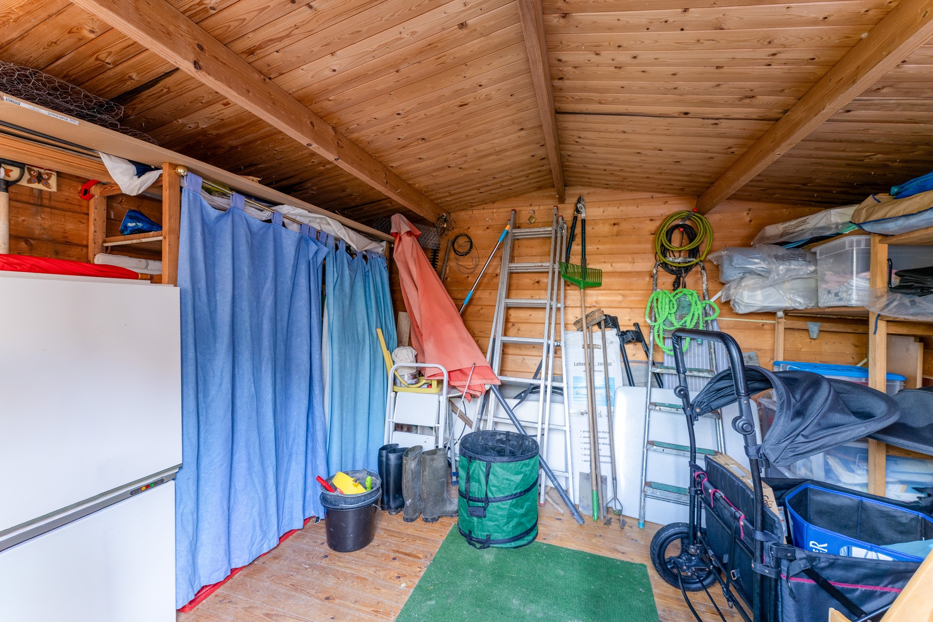 De voortuin biedt ruimte om twee auto’s op eigen terrein te parkeren en geeft toegang tot de houten berging, die verrassend ruim is en perfect voor fietsen, strandspullen en tuingereedschap. Via de zijkant van het huis loop je gemakkelijk naar de achtertuin, waardoor beide zijden van het perceel goed bereikbaar zijn.